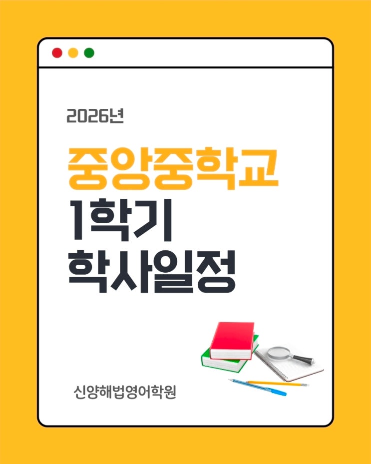 새 학기가 시작된지도 벌써 2주째 접어드는데요. 특히 갓 입학한 중1 해법이들도 이제는 조금씩 새로운 학교생활과 학업에 익숙해져가고 있는듯 합니다. 많은 학부모님들께서 가장 궁금해하시는 것이 바로 학교 학사일정과 시험 일정입니다. 특히 중학생은 시험 준비 시기를 언제 잡느냐에 따라 결과가 달라지기 때문에 미리 일정을 확인하고 계획을 세우는 것이 중요합니다. 우리 신양해법영어학원 중등해법이들이 가장 많이 다니고 있는 학교 양산 중앙중학교! 오늘은 양산 중앙중학교 2026년 1학기 주요 학사일정을 정리해드립니다. 3/2. 개학식.입학식 3/26. 교육과정설명회 3/30. 과학의날 행사 4/14. 1학년 진로탐색활동 4/22~4/24. 1학기....... <img src="https://blogthumb.pstatic.net/MjAyNjAzMTFfMTQ1/MDAxNzczMjMwMTQwMzQw.zOzP8opS06cNmBUes8uv3LEmdfvBNZFDFMz0fZ96AN8g.XUymwUWOgUlVxT-4qWhOS8UOeRooLOeQVmaHR3Xk45Qg.JPEG/900%A3%DFScreenshot%A3%DF20260311%A3%DF115411%A3%DFCanva.jpg?type=s3" />
