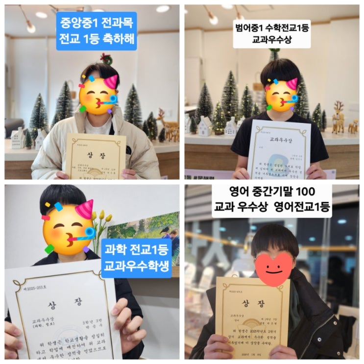 각 학교에서 ‘교과 우수상 / 전교 1등’은 아무에게나 주어지지 않습니다. 그 교과 전체에서 가장 뛰어난 성취를 이룬 학생에게 주어지는 상. 이번 학기, 앤즈의 아이들이 그 주인공이 되었습니다. 점수만 높은 아이들이 아닙니다. 꾸준히, 성실하게, 자기 자리를 지키며 성장해 온 아이들. 앤즈는 “잘 가르치는 학원”이기 전에 “잘 자라게 하는 곳”이고 싶습니다. 아이들의 노력과 성장을 진심으로 축하하고, 끝까지 함께해 주신 학부모님께도 깊이 감사드립니다 우수학생 ㆍ성장한 학생들 스토리는 계속됩니다.. #앤즈스터디메이트 #교과우수상 #전교1등 #결과로증명하는앤즈 #성장으로말합니다 <img src="https://blogthumb.pstatic.net/MjAyNjAxMTJfNDQg/MDAxNzY4MjI1NDU0MTU3.NuIK3x_6HIrqTY0U3VkzdBqWNrKV6mEI9ztgD3ihXFgg.hU9llRCKJCY38hmg8wFuS5R-cW9o9xZHUrYAxPCXL7Eg.JPEG/900%A3%DFGridArt%A3%DF20260112%A3%DF223441646.jpg?type=s3" />