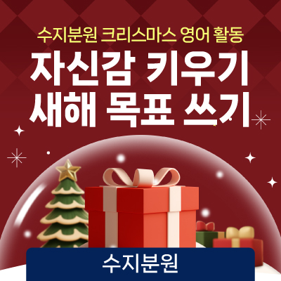 안녕하세요! 정상어학원 수지분원입니다 번 활동의 주제는? 이번 크리스마스 영어 활동의 주제는 “What Are Your New Year’s Resolutions?” 입니다. 새해를 앞두고 학생들이 자신의 생각과 목표를 영어로 직접 표현해 보는 활동으로, 영어를 ‘공부’가 아닌 의미 있는 언어로 경험해 볼 수 있도록 구성했습니다. 크리스마스 트리 포스터 활동 크리스마스 트리 모양의 포스터를 활용해 학생들은 각자 새해에 이루고 싶은 목표나 다짐을 영어 문장으로 작성해 보았습니다. “I want to…”, “I will…”, “My goal is to…” 등 다양한 표현과 어휘를 활용하며 자신의 생각을 영어로 자연스럽게 풀어내는 연습을 할 수 있었습니다. ....... <img src="https://blogthumb.pstatic.net/MjAyNjAxMjBfMTQ5/MDAxNzY4ODc3MzIzNzIw.tIMcf25tvOk484FJT2mJGDpksYPxeBfXZBaG13l3yCcg.IuMDs-uu0DHzETPy8FpT4Oe_iUl9MVtDLFgVs-gB6Qog.JPEG/260120_%BA%ED%B7%CE%B1%D7%BD%E6%B3%D7%C0%CF%28%BC%F6%C1%F6%29.jpg?type=s3" />