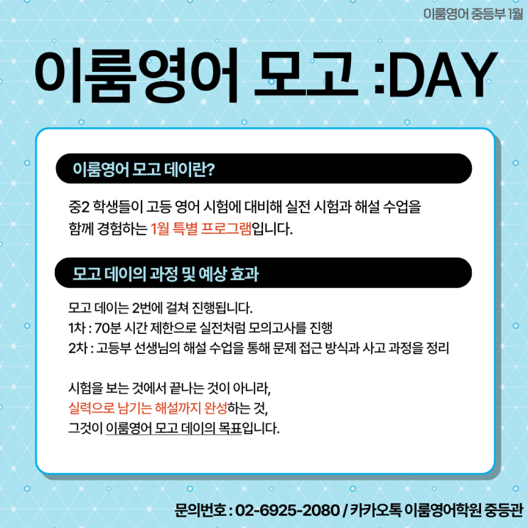 중2(예비중3) 1월 힘차게 시작해봅시다! 이 프로그램은 이룸영어 재원생들에게만 제공됩니다. 재원생, 학부모님들께는 관련 내용 안내문이 전송됩니다. <img src="https://blogthumb.pstatic.net/MjAyNjAxMjBfMjk3/MDAxNzY4ODUwNTE5OTYz.k7X4ma3UZEbIDGyLr9an57qB3kSC8-kWzbezHnGOs_0g.0aHckR0mYDG2o3Htxu8bKkd3mCfZyQ0TypzP1RTZrnkg.PNG/%B8%F0%B0%EDday1.png?type=s3" />