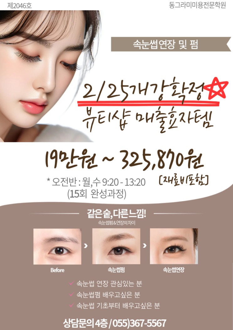 양산 속눈썹창업 속눈썹연장 양산속눈썹학원 양산속눈썹국비 양산내일배움카드 동그라미미용전문학원 주소 경남 양산시 물금읍 야리2길 43 403호 2증산역 1번 출구에서 374m미터 찾아가는길 부산 2호선 증산역 1번 출구 도보 5분 거리입... 영업시간 오전9시 부터 오후10시까지 전화번호 0507-1332-5568 블로그 https://blog.naver.com/dongrami5567 https://blog.naver.com/dongrami5567 채팅상담문의는 밑에 링크 클릭! 전화상담은 055-367-5567 https://talk.naver.com/ct/wzoidb0?frm=mnmb#nafullscreen 양산 속눈썹학원 동그라미미용전문학원에서 속눈썹 수강상담 받은 솔직 후기 요즘 속눈썹 연장과 속눈썹 펌에 대한 관심이 높아지면....... <img src="https://blogthumb.pstatic.net/MjAyNjAyMTFfMTQ4/MDAxNzcwNzc3ODIzOTE3.UHIUrfJXvLr3stbE4TH_98g-KFokbtp2mQk4x4HiapUg.stFcKxRswfoCP8UHI46ttPg5_GYnmbMpOWPhi6WwrGMg.PNG/%C1%A6%B8%F1%C0%BB_%C0%D4%B7%C2%C7%D8%C1%D6%BC%BC%BF%E4..png?type=s3" />