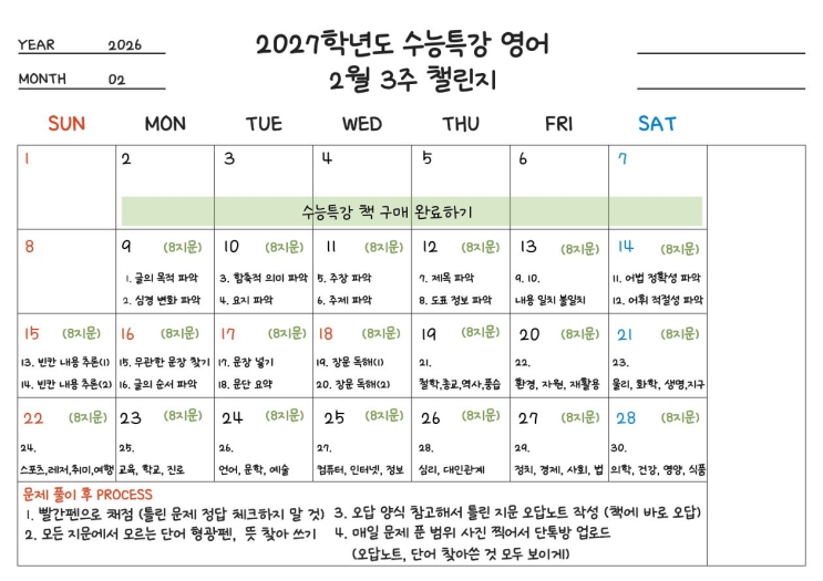 안녕하세요 에이닷 영어학원 원장 김지환입니다! 벌써 올해 수능특강이 출시되었습니다! 수능특강. 사실 고3 학생들이라면 구매하지 않은 친구들은 없을거에요 하지만.... 시작은 거창했는데 2주쯤 지나면 표시만 잔뜩 해놓고 진도는 제자리였다는...안타까운 소문이 정말 많았습니다. 현장에서 여러 번 깨달은 사실은 문제를 많이 풀겠다는 의지만으로는 결코 오래 못 갈 수 없습니다. 결국 성패를 가르는 건 ‘언제 무엇을 어떻게 반복할지’가 적힌 루틴이더라구요. 그래서 2월 한달간 수능특강을 모두 풀 수 있도록 챌린지를 시행합니다! 단순히 푸는 것에서 그치면 너무 아쉽죠. 수능특강은 수능에 간접연계 되는 교재입니다! 간접 연계는 교....... <img src="https://blogthumb.pstatic.net/MjAyNjAyMDRfMTgz/MDAxNzcwMTk3Njk1NzUw.g6BkqChDmRVSWTJeUsI87_BpkO2eUho1iriCrO_l0B4g.odhaPK3mVsSTpeHvMRRw4n2mKQVkuo_TNICvF17uVyYg.PNG/image.png?type=s3" />
