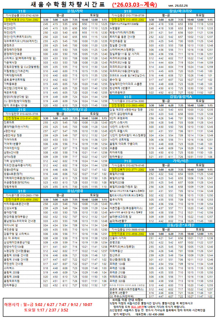 [공지] [2026년 셔틀] 3/3(화) ~별도 공지 전까지 변경된 셔틀 시간표