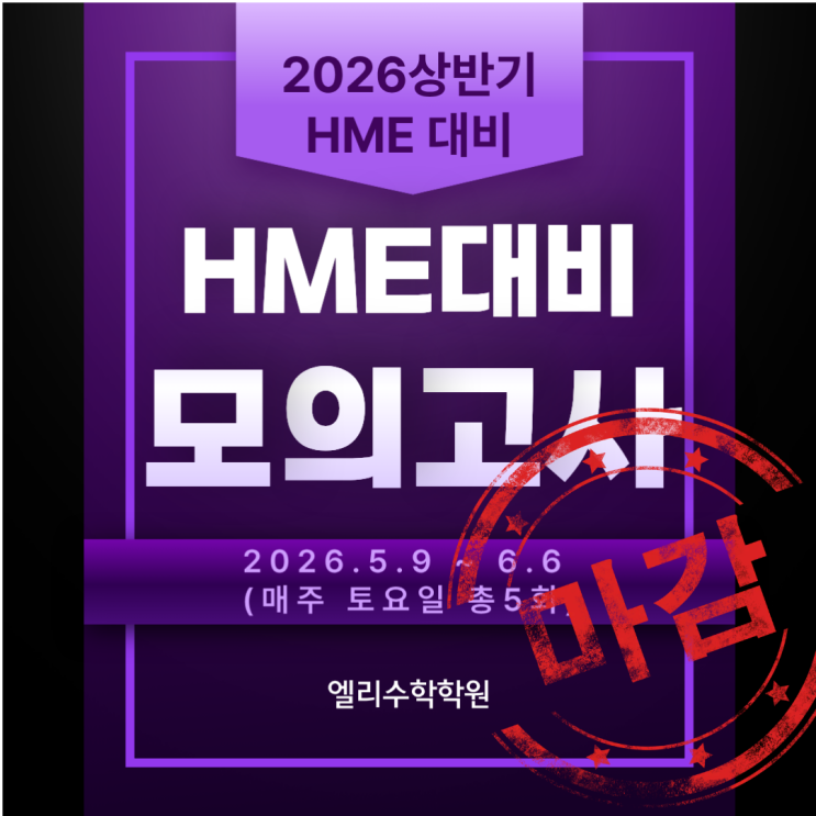 1. 많은 관심에 감사드립니다 — 정규 접수 마감 안내 — 공지 이후 정말 많은 학부모님께서 빠르게 연락 주셨습니다. 덕분에 2026 상반기 HME 5주 완성 프로젝트의 전 학년 정규 접수가 마감되었습니다. 진심으로 감사드립니다. 2026 상반기 HME 응시자/모의고사 신청자 수가 역대 최대를 기록했습니다. 해마다 조금씩 늘어오던 관심이, 올해는 눈에 띄게 다른 분위기입니다. 수학 경시대회가 일부 상위권 아이들만의 이야기가 아니라, 많은 아이들이 "나도 도전하고 싶다" 는 적극적인 마인드로 빠르게 바뀌고 있다는 것을 현장에서 몸소 느끼고 있습니다. 엘리수학의 모의고사 신청이 이렇게 빠르게 마감된 것도, 그 흐름과 무....... <img src="https://blogthumb.pstatic.net/MjAyNjA0MjZfMjQ0/MDAxNzc3MTUzMjkxODA3.HedyfoRbqJGd2WVS4pSDYMakDZ-Sl8sHaJkYAd6OyqMg.2t-WNkBsaNdP1eHXd_QUiopmQ7feLYyaOYA4oP-yFiwg.PNG/%C1%A6%B8%F1%C0%BB_%C0%D4%B7%C2%C7%D8%C1%D6%BC%BC%BF%E4._%2812%29.png?type=s3" />
