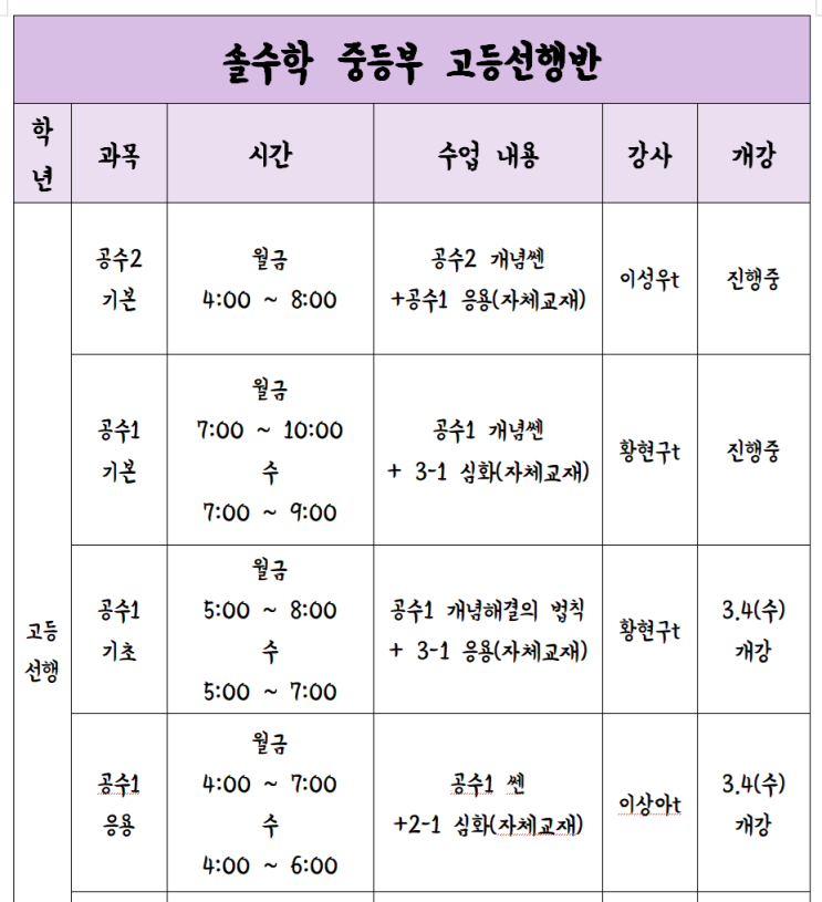안녕하세요. 시그마수학 학원에서 2026년 3월 개강안내 드립니다. 개강:3월 3일 화요일 3월 방학 동안 공부한 기본개념을 정리하고 문제풀이를 실시할 예정이며 현행문제풀이를 병행합니다. 3월말~ 1학기 중간고사 만점 또는 1등급을 목표로 한 시험대비 체제로 전환하게됩니다. ●고1 *고등1A* 요일: 월.수.금 시간: 5시-8시 교재: 자이스토리,자체교재 *고등1B* 요일: 화목토 시간: 7시-10시(토 오후1시) 교재: 자이스토리,자체교재 *고등1C* 요일:월수금/화목토 시간: 7시-10시(토 오후1시) 교재: 개별진도반 ●고2 *고등2A* 요일: 월.수.금 시간 : 7시~10시 교재: 고쟁이, 자체교재 *고등2B* 요일: 화목토 시간: 5시-8시 /토(10시-1시) 교재.......