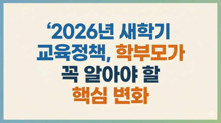 2026년 새학기가 성큼 다가왔습니다. 교육부에서 학부모님과 학생들이 꼭 알아야 할 핵심 교육 정책들을 새롭게 발표했는데요. 정부 공식 발표 자료를 바탕으로, 학부모님들이 이해하기 쉽게 핵심만 뽑아 완벽하게 정리해 드리겠습니다. 초3 대상 '방과후 프로그램 이용권' 신규 지원 초등학교 3학년 자녀를 두셨다면 꼭 챙기셔야 하는데요. 방과후학교 참여를 희망하는 초3 학생들에게 연간 약 50만 원 상당의 '방과후 프로그램 이용권(바우처)'이 새롭게 지급됩니다. 학부모님들의 사교육비 부담을 크게 덜어주고, 아이들이 자신의 흥미에 맞는 다양한 프로그램을 마음껏 선택할 수 있는 좋은 기회가 될 것입니다. 위기 학....... <img src="https://blogthumb.pstatic.net/MjAyNjAyMjdfMjQy/MDAxNzcyMTgwMzIyNzI0.Gm1IFwbpOALCNHbjUVHKbSEO4ZehSSQ5rZVtkZ5a1C8g.OlNxt7eFDY-vlPyOzEZyFunePTJcb-A99qFthcPkNpkg.PNG/Gemini_Generated_Image_l9b4y5l9b4y5l9b4.png?type=s3" />