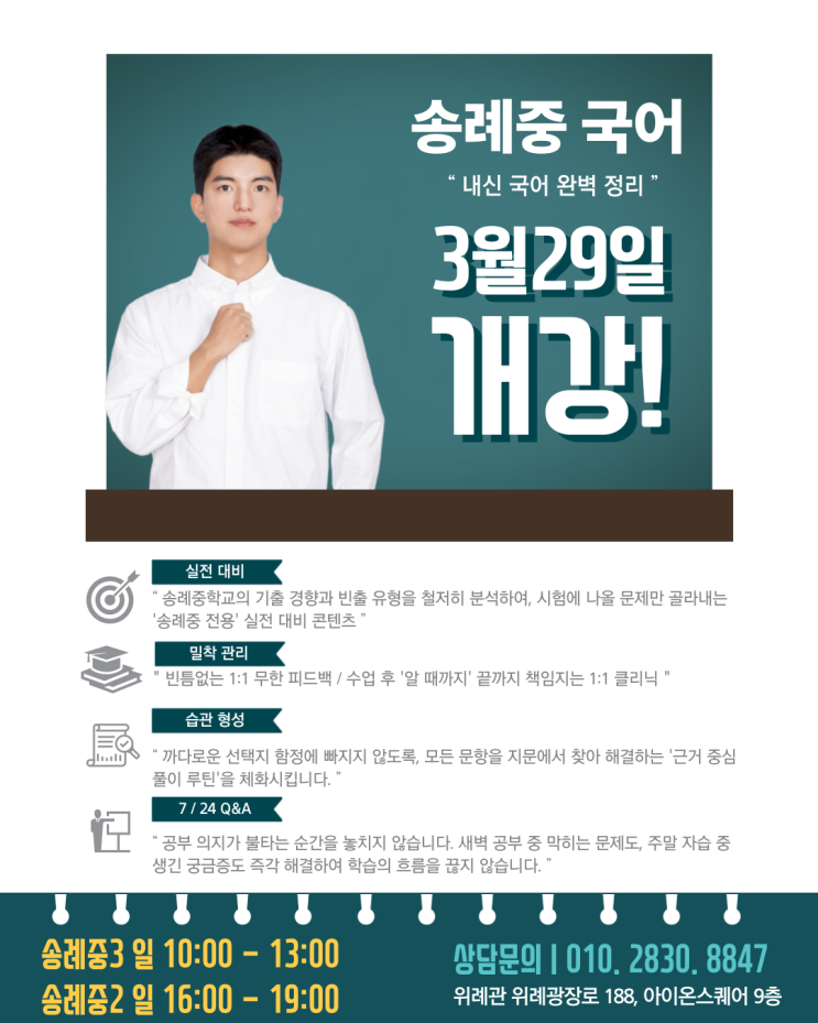 송례중학교 학생들과 학부모님들, 안녕하세요! 새학기 시작을 앞두고 국어 내신 대비에 대한 고민이 많으실 텐데요. 송례중 국어 내신의 특징을 완벽하게 분석하여 고득점으로 이끌어줄 [송례중 전용 국어 내신 대비반] 개강 소식을 전해드립니다! 이번 시험, 확실한 전략으로 준비하고 싶다면 주목해 주세요. 3월 29일(일) 개강! 송례중 맞춤형 커리큘럼이 드디어 시작됩니다. 중학교 국어는 고등학교 수능 국어의 기초가 되는 만큼, 단순히 암기하는 것이 아니라 '원리'를 이해하는 것이 핵심입니다. ⏰ 수업 시간 안내 송례중 3학년: 매주 (일) 10:00 – 13:00 송례중 2학년: 매주 (일) 16:00 – 19:00 내신 수업은 본 수업 5회차, ....... <img src="https://blogthumb.pstatic.net/MjAyNjAzMDJfMTc0/MDAxNzcyNDU1NDAwMjUz.kcPU9X3OP0UCXI6K9lEGSZGI07xyOf_zCX3GOAZVc1sg.1AQYeJdIGvN9IQxff6NaSoHvHfV0Apa6UzsitsASre0g.PNG/%C1%A6%B8%F1%C0%BB-%C0%D4%B7%C2%C7%D8%C1%D6%BC%BC%BF%E4_-001.png?type=s3" />