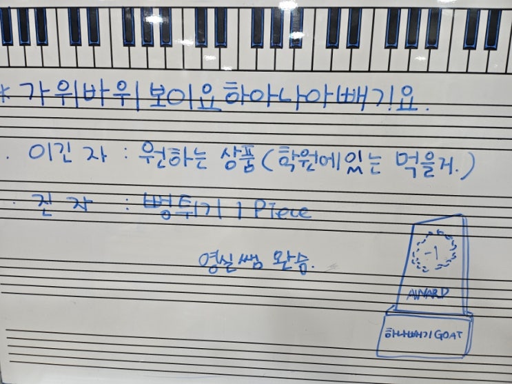 저희 학원은 매주 목요일마다 (목요일에 못오는 친구는 금요일이나 다른 요일에 ^^) 뽑기나 간식을 얻기위한 챌린지, 이벤트를 열어요. 하나빼기를(어린 친구들은 가위바위보) 했었는데 어쩐지 영실쌤이 완승을 해버렸다. 묵찌빠로 영실쌤을 이겨라 예서가 장난쳐놨는데 룰렛돌리기도 가끔 한다. 추억의 뽑기도 하곤 했다. 리듬 박자에 맞게 박수나 따라부르기 챌린지도 하고.. 가장 최근엔 둥 타이밍 맞히기 진행. 영실쌤은 칠판에 모든걸 알려줬음. 매번 온몸으로 시범도 보여줬음ㅎㅎ 큰 애들은 못맞히면 어쩔 수 없다 어린 친구들이겐 약간의 오차도 허용해주었다. 핫도그 주고 싶으니까.. 이번에 초등학교 입학하는 서윤이와 혜리에겐 원장....... <img src="https://blogthumb.pstatic.net/MjAyNjAzMTBfMjY2/MDAxNzczMTMzNDI1NDMw.5V7fWJK7bB4LpTfz4gYiNlKiQaP6IjNCVKwWZ1voQNEg.J5jKOofi629sDZSnFWukgBR15GTPrEMqK602LNuw9vog.JPEG/900%A3%DF1772170359691.jpg?type=s3" />