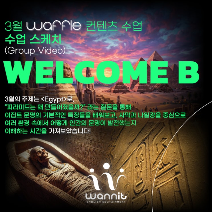 송파구 가락동에 위치해 경험위주의 커리큘럼으로 언어로써의 영어 교육을 오늘도 고민하고 또 고민하는! 초등·중등 전문 영어학원 WANNIT(워닛) 영어학원입니다. 워닛(WANNIT) 영어학원은 매 월 과학, 인문, 예술, 역사, 문화에 따른 신선한 주제를 선정하여 한 달간 심도있게 탐구할 뿐만 아니라, 관련된 현장학습을 찾아 떠나기도 합니다! Welcome B 반의 이번 3월 수업주제는 고대 문명의 중심지, 였습니다! 아이들은 먼저 "피라미드는 왜 만들어졌을까?"라는 질문을 통해, 이집트 문명의 기본적인 특징을 배워보고 사막과 나일강을 중심으로 형성된 환경 속에서 어떻게 문명이 발전했는지 이....... <img src="https://blogthumb.pstatic.net/MjAyNjA0MjhfMTEg/MDAxNzc3Mzc1NTY0NDky.DTM7XCY_thTPh-wkrPU-2WcMeZf5Bhl8hYszCUbKst4g.qzIOQPZXzmZCFGmgLFoNAijQxy1_urMWROtXnMCRkkIg.JPEG/%BA%ED%B7%CE%B1%D7_%BD%E6%B3%D7%C0%CF_ver_2_%BA%B9%BB%E7%BA%BB-027.jpg?type=s3" />