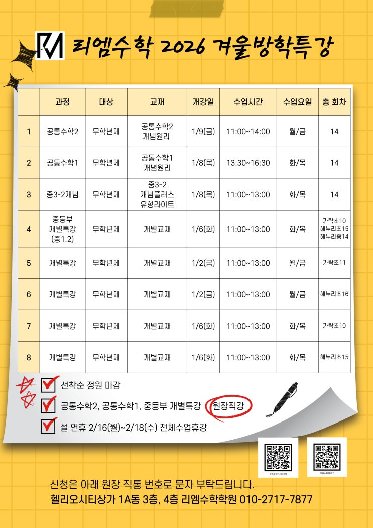 안녕하세요. 리엠수학학원입니다. 1년에 2번씩 저는 도전을 하는데요.. 그건 바로.. 학부모님들의 특강 문의보다 먼저 짜기..입니다. 신경을 썼지만... 이번에도.. 제가 늦었습니다..ㅎㅎ;;;;;;; 리엠수학 특강을 찾아주셔서 늘 감사드리며 다음에는 제가 더 빨리.. 하겠습니다~^^ 리엠수학 2026 겨울방학특강 시간표 입니다! *개별특강 이외의 수업은 판서수업입니다. *예비중1.2는 4번 중등부개별특강 추천드립니다. *선착순 정원 마감이니 위 번호로 문자신청 부탁드립니다. *설연휴 주간인 2월16일(월)~2월18일(수) 모든 수업 휴강입니다. 방학은 기회입니다. 이제 우리 리엠 재원생들은 당연~히 수학 데이가 있다는 걸 알고, 같이 시간표 짰....... <img src="https://blogthumb.pstatic.net/MjAyNTExMjFfNTgg/MDAxNzYzNzE2NDQzMjYw.7E_txmF7fGQB27OEjdblxrrOBk23ZLVHVS_gzWMczPQg.nkNhnl5PNZ0oSQUjOTqGWahoPPsqGhEbwwGB32MzxTwg.JPEG/2026%C6%AF%B0%AD%B0%E8%C8%B9.jpg?type=s3" />