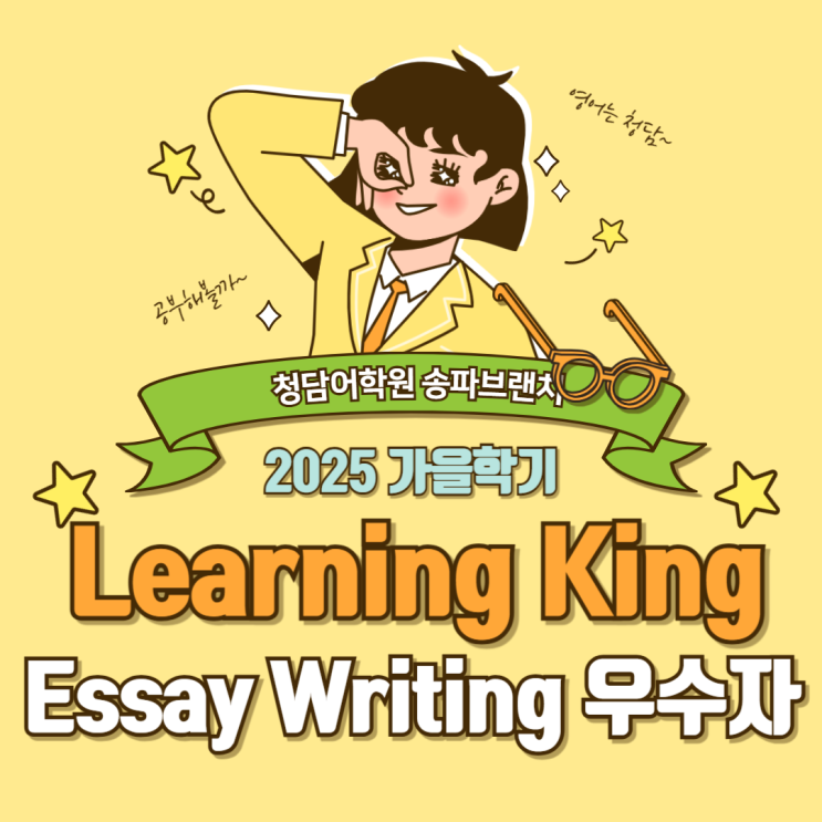 청담어학원 송파브랜치 가을 Essay & Learning King 가을 에세이 & 러닝킹 우수자 발표 안녕하세요, 청담어학원 송파브랜치입니다! 2025년 가을 학기 동안 우리 학생들이 보여준 열정과 노력은 정말 놀라웠습니다. 오늘은 그 결실을 맺은 두 가지 특별한 우수자 명단 소식을 전해드립니다. 지난 2025년 가을 학기 동안 우리 학생들이 보여준 열정과 노력에 박수를 보냅니다. 이번 학기에는 두 가지 특별한 시상 소식을 전해드립니다. ✍️ 가을 에세이 우수자 발표 청담어학원의 숙제 웹사이트 [크레버스 러닝포털]을 통해 제출된 Writing 과제 중, 첨삭을 거쳐 가장 뛰어난 글을 작성한 학생들을 선정했습니다. 이 학생들의 멋....... <img src="https://blogthumb.pstatic.net/MjAyNTEyMDhfOTUg/MDAxNzY1MTkzNzg0MTI3.pllxocsxN4hHeALcZeN7sweeMieQr_lgVJQ_ysbUA44g.ounloSJaX6im2iFXITW_sk9Bi4dwUjkHaG7N9X-fhT4g.PNG/Learning_King.png?type=s3" />