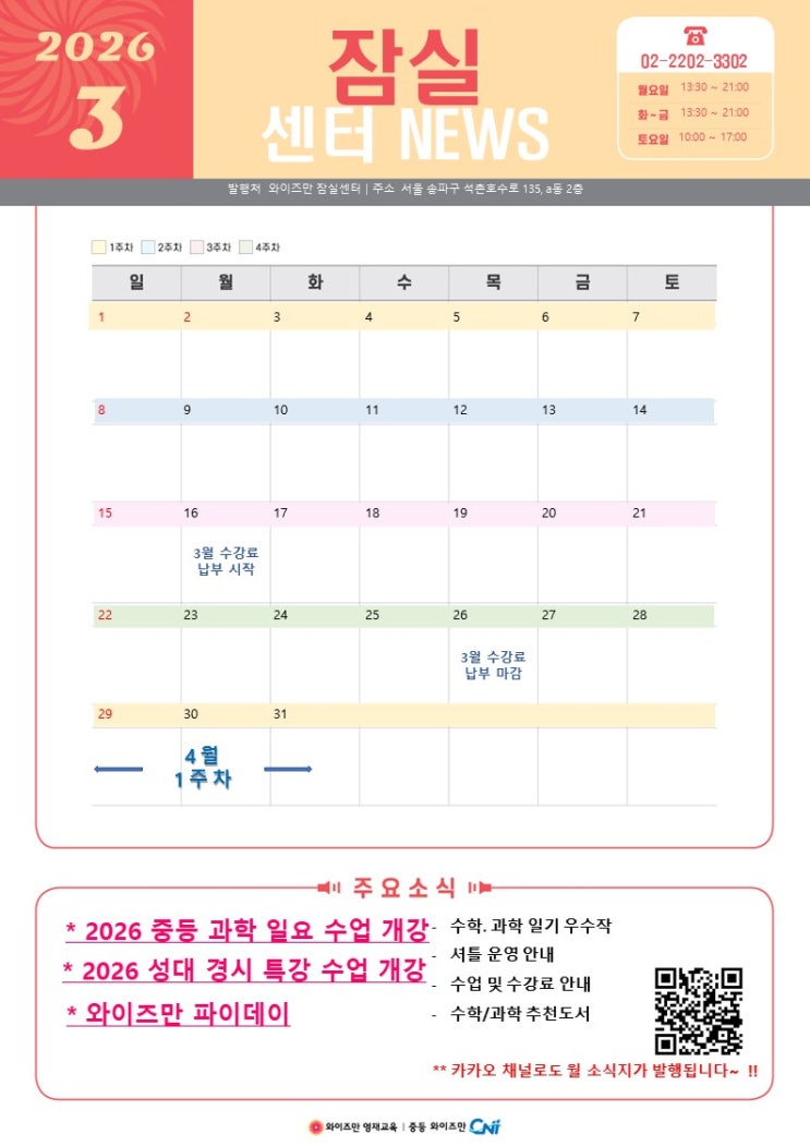 2026.3 월 소식지 발행되었습니다. 경시 특강과 일요 중등 이론 수업 개강 소식이 있습니다.!! <img src="https://blogthumb.pstatic.net/MjAyNjAyMjdfMTUw/MDAxNzcyMTkwNTE5NDA5.D5lo1bXUgkoWci8CyW96pwAYFqUqkFEl2ByT6TkqN1cg.2h6Fi6jxWUS91f_UqA4mQMOsUUuSUqW-mXkZ88w8c_Mg.JPEG/%BD%BD%B6%F3%C0%CC%B5%E51.JPG?type=s3" />