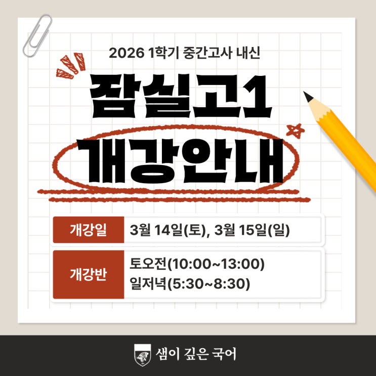 안녕하세요, 샘이깊은국어학원입니다. 어느덧 따뜻한 봄기운이 느껴지는 3월이 다가오고 있습니다. 새로운 교복을 입고 고등학교에 입학하는 우리 잠실고 1학년 학생들, 그리고 학부모님들 모두 설렘과 동시에 다가올 첫 내신 시험에 대한 긴장감이 크실 텐데요. 기다려주신 많은 분들을 위해 2026학년도 1학기 중간고사 잠실고1 내신반 시간표를 안내해 드립니다. 수업 시간 • 토요일 오전반 (10:00~13:00) • 일요일 저녁반 (5:30~8:30) 개강일 • 3/14(토), 3/15(일) 고등학교 진학 후 첫 내신인 만큼, 학생 개개인의 취약점을 꼼꼼하게 밀착 관리하며 성적 향상을 이끌어내겠습니다. 올해 잠실고 1학년 학생들의 눈부신 성장을 지....... <img src="https://blogthumb.pstatic.net/MjAyNjAyMjVfOTMg/MDAxNzcyMDA0NTg1MTUz.iMG7nCoC-XTZ8N1-u_YRt_-pZ826j7aI-0nH2rOZvNIg.XNG1O8-Vh_ZXihrGyuUB5FHJv03VteS2o46dMPczq_kg.PNG/%C1%A6%B8%F1%C0%BB_%C0%D4%B7%C2%C7%D8%C1%D6%BC%BC%BF%E4._%2823%29.png?type=s3" />