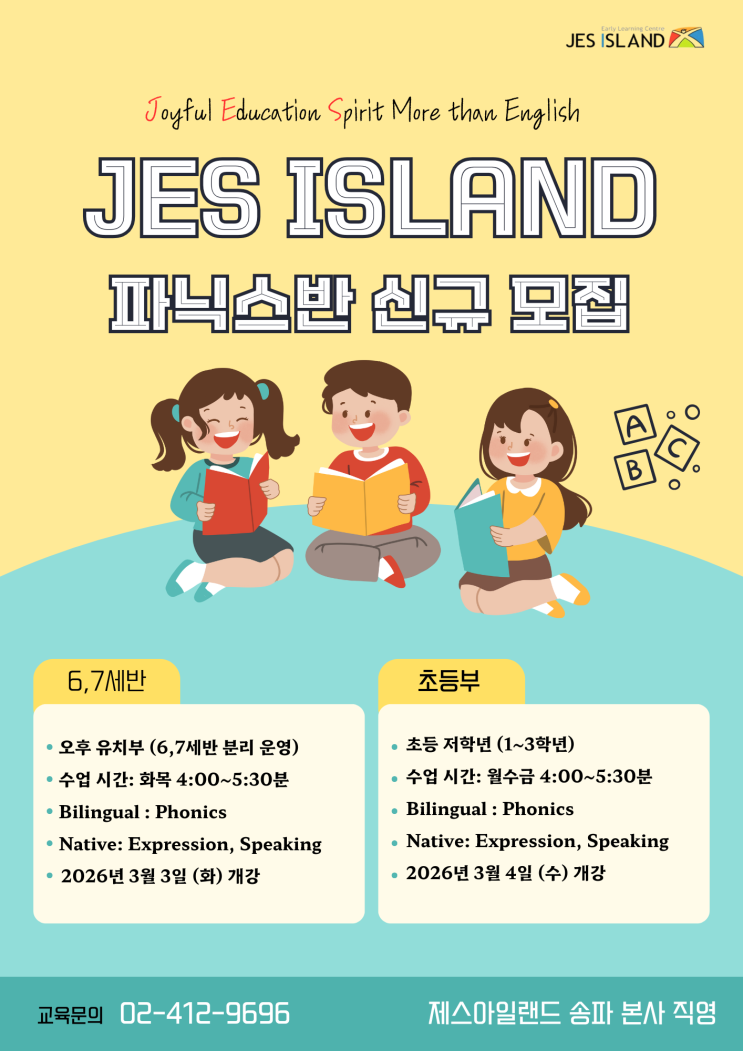 JES ISLAND 파닉스반 신규 모집 Joyful Education, Spirit More than English 아이의 영어 실력보다 먼저, 영어를 즐기는 태도와 자신감을 키우는 JES ISLAND 파닉스반 신규 모집을 시작합니다. ▶ 6·7세 유치부 (6세반 / 7세반 분리 운영) 수업시간: 화·목 4:00~5:30 *Bilingual : Phonics *Native : Expression / Speaking *2026년 3월 3일 (화) 개강 ▶ 초등 저학년 (1~3학년) 수업시간: 월·수·금 4:00~5:30 *Bilingual : Phonics *Native : Expression / Speaking *2026년 3월 4일 (수) 개강 제스아일랜드 송파 본사 직영 교육 문의: 02-412-9696 10명 수업으로 정원 마감 시 조기 마감될 수 있습니다. <img src="https://blogthumb.pstatic.net/MjAyNjAxMjZfMjQ5/MDAxNzY5NDAzNDY0NDU0.xWQaqJsY1OM6rOQlqMPr5jcMP5eu4J5fJuBwTelHvwQg.y7beIgUq2SzCvrySvimdyYhkAV9-bgCu_hmvuiVB1uog.PNG/%C6%C4%B4%D0%BD%BA_%BD%C5%B1%D4_%B8%F0%C1%FD_%282026._3%BF%F9%29.png?type=s3" />