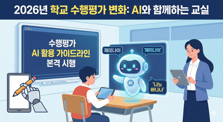 안녕하세요! 요즘 SNS나 과제물 등 일상 곳곳에서 젠스파크(Genspark AI), 제미나이(Gemini)나 나노 바나나(Nano Banana) 같은 생성형 AI가 활발히 쓰이고 있죠? 기술이 발전한 만큼, 학교 현장에서도 AI를 활용한 과제가 늘어나고 있는데요. 최근 교육부와 시도교육청에서 수행평가 시 AI 활용 관리 방안을 발표했습니다. 2026년부터 우리 학생들의 학교생활에 어떤 변화가 생길지, 핵심 내용만 쏙쏙 뽑아 정리해 드릴게요! 2026년, 무엇이 달라지나요? 이제 학교 수행평가에서 AI를 무조건 금지하는 것이 아니라, '현명하고 공정하게' 공존하는 방향으로 나아갑니다. 시행 시기: 2026년부터 본격 적용 대상: 전국 중·고등학교 수....... <img src="https://blogthumb.pstatic.net/MjAyNjAxMjdfMTUy/MDAxNzY5NTE5MzEzMzAz.r_PQdwfiYPd4jF9-0YkpXJh7DBzVszeSIHMdA0RfCfAg.uY-ID1IXckhI6bmxvl_2JJ8TDpDqg25TO8Saf6mXEFUg.PNG/Gemini_Generated_Image_lsk099lsk099lsk0.png?type=s3" />
