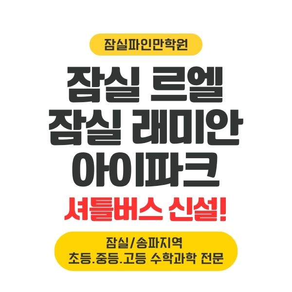 안녕하세요! 송파구 잠실권 신축 아파트 입주를 앞둔 학부모들 사이에서 많은 문의 주고 계신 잠실/송파 지역 초등·중등·고등 전문 수학학원 ‘파인만학원’ 입니다. 혼잡하고 경쟁이 심한 대치동에서 초등학생 아이를 둔 학부모님들께서 도곡.서초.잠실 쪽으로 많이 이동하는 추세라고 합니다. 특히 잠실은 최근 르엘, 래미안 아이파크등 새 아파트 입주로 초중등학생들의 학원 걱정이 많으실텐데요. 잠실 르엘 / 잠실 래미안 아이파크 거주학생 대상으로 셔틀버스 신설했으며 2월 28일까지 무료 진단고사 진행합니다. ▲ 사진 누르시면 진단고사 예약 가능합니다 :) 저희 파인만학원은 초등부터 고등까지 학년별 전문적인 커리큐럼으로 운영 되....... <img src="https://blogthumb.pstatic.net/MjAyNjAxMDVfOSAg/MDAxNzY3NjE2NDYxODQ4.M8BuDTkha2DKAPW9NBPFl4-Kpl9gqUmuDMb49iMO3PYg.CgLVHpgm6IAlEF7VObfNfxcHo9xPmg_dzpqcfzbZlW4g.JPEG/%C0%E1%BD%C7_%BC%C5%C6%B2%B9%F6%BD%BA_%B7%A1%B9%CC%BE%C8_%B8%A3%BF%A4_%281%29.jpg?type=s3" />