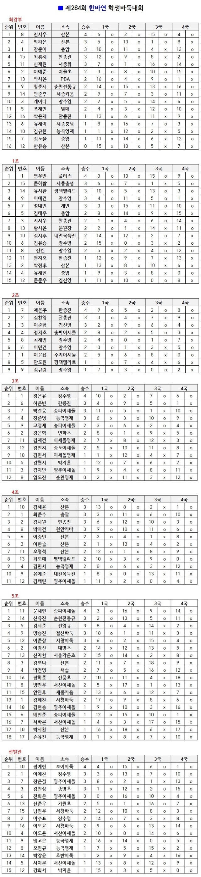 안녕하세요~ 이세돌바둑학원 서울 송파위례직영점 입니다^^ 오늘은 1월 10일 토요일, YBM연수원에서 열린 제284회 한바연 바둑대회 포스팅을 진행하겠습니다~ 한바연 바둑대회는 세계정상급 프로기사들의 유소년 시절에도 참여하였던 대회로 유구한 역사와 전통을 지니고 있는 만큼 전국 각지의 수많은 바둑 영재들이 이번 대회 역시 출전하였습니다! 본원에서는 우승과 승조라는 아주 좋은 성적을 거두었습니다! 이번 대회에 참여한 모든 학생들이 다음 대회를 향해 더욱 발전할 수 있기를 바라면서 포스팅을 마무리하겠습니다~^^ <제 283회 한바연 바둑대회> 5조: 문*현(4승 0패) 우승 3조: 박*웅(3승 1패) 승조 3조: 고*재(2승 2패) 잔....... <img src="https://blogthumb.pstatic.net/MjAyNjAxMTJfNTUg/MDAxNzY4MTk4NTgzMTU5.xXOrcXKpEWyMCrpVB6HqhaXmhTVIiFIdjIzRcrAwINkg.62xYWxYqSLbC2AdXqhzeJCn64-8a-S1Q_QYLTNEUM4gg.JPEG/KakaoTalk_20260112_145701044.jpg?type=s3" />