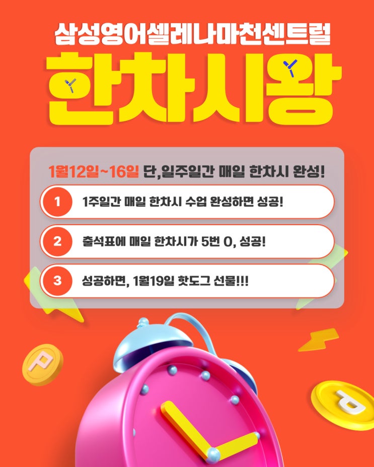 안녕하세요! 마천초 정문 앞 영어 자신감, 삼성영어셀레나 마천센트럴 캐티원장입니다. 마천초등학교의 개학일인 1월 27일이 어느덧 2주 앞으로 다가왔습니다! 긴 방학의 끝자락, 아이들이 "이제 곧 개학이니까~" 하며 학습의 끈을 놓기 쉬운 시기이죠. 하지만 우리 마천센트럴 셀린이들은 다릅니다! 남은 2주를 누구보다 알차게 보내고, 기분 좋게 신학기를 맞이할 수 있도록 [겨울방학 학습 부스팅 이벤트 3종]을 준비했습니다. 선물은 풍성하게, 공부 습관은 촘촘하게 잡는 현장을 소개합니다! 학습 열기 UP! 부스팅 이벤트 3가지 1. [한차시 이벤트] 공부도 식후경! 핫도그가 팡팡! 기간: 1월 12일(월) ~ ....... <img src="https://blogthumb.pstatic.net/MjAyNjAxMTNfMTcw/MDAxNzY4Mjg2NDA5NzUw.OFUGOJl-PZaNMKZjTteN2GlQovIxkX_ZhiPZ3Ea8eOQg.HaumoeAtF8kxxnX6qD4hts0ZbOykDmTvypjDyaSan2Eg.JPEG/%C7%D1%C2%F7%BD%C3%BF%D5-001_%281%29.jpg?type=s3" />