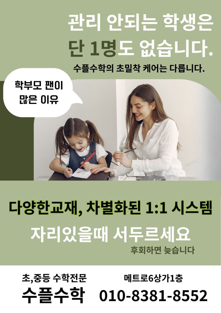 학부모 팬들이 많은 이유? 직접 겪어봐야 아시겠죠? 관리 안되는 학생이 단1명도 없는 이유? 겪어봐야 아시겠죠? 아무리 설명해도 겪어보지 않으면, 이해하지 못합니다. 수플수학만의 차별화된 1:1 맞춤 시스템, 20년 관리 노하우로 밀착케어 가능 자리선점 하셔야해요. 소수정예입니다. 010-8381-8552 #수플수학 #수플수학교습소 #마산수학 #마산수학학원 #양덕수학 #양덕수학학원 #양덕초등수학 #양덕초등수학학원 #메트로수학 #메트로수학학원 #중등수학학원 #초등수학학원 #중앙중학교 #중앙중 #양덕중 #중앙중 #중앙중학교 #양덕중학교 #가고파초등 #가고파초등 #대형학원 #소수정예 <img src="https://blogthumb.pstatic.net/MjAyNjAzMTZfNjYg/MDAxNzczNjUyOTgzMDcz.3lJVGKV0-IEHXFM4iML4UeajYRzf6fk9I_ef2CSb2Kog.nCFunNsYXOh-x4VylimUg2DStdeH4VvHagIjnoCJxqwg.JPEG/Green_Abstract_Happy_Teacher_Day_Celebration_Facebook_Post_%284%29.jpg?type=s3" />