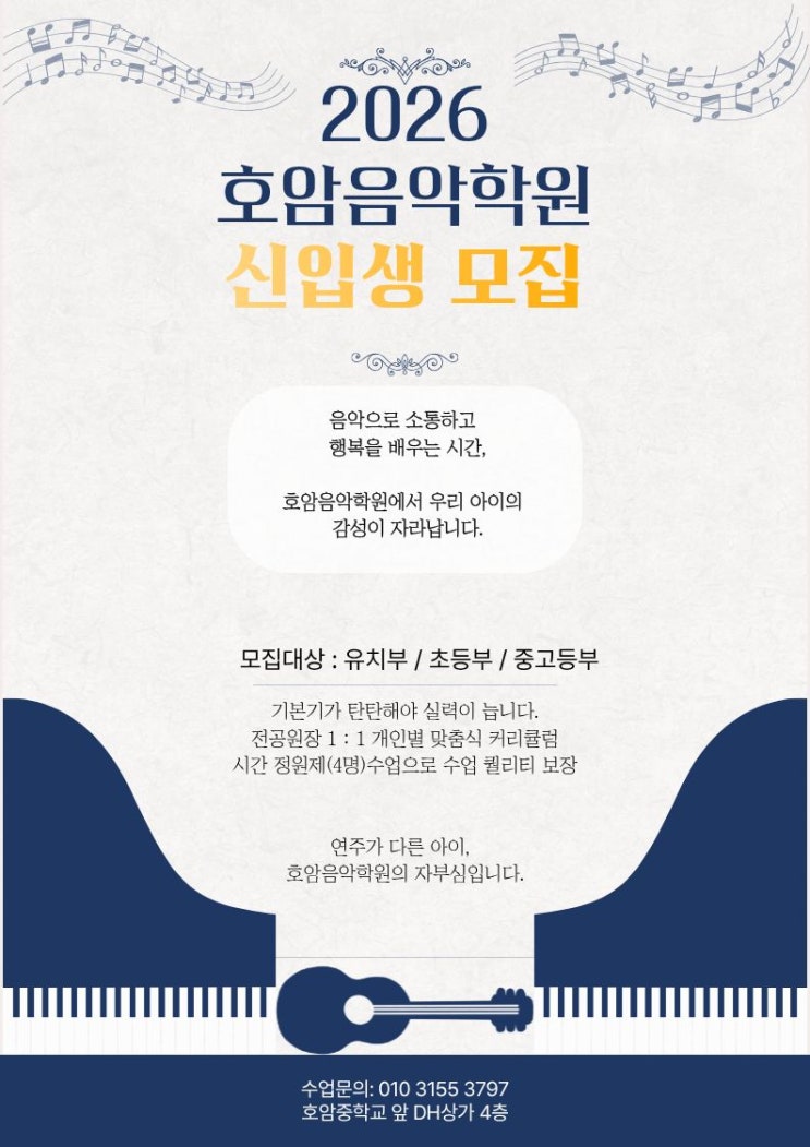 소중한 아이를 새로운 곳에 보낼 때의 걱정되는 부모님의 마음, 그 무게를 잘 알기에 더욱 사랑으로 보듬겠습니다. 전문가의 눈으로 세심하게 이끌어, 학원에 오는 발걸음이 가장 즐거운 시간이 되도록 만들겠습니다. ☆시간별 소수정원제(4명) 학원입니다. ☆주1회 ~ 주4회 까지 선택가능. ☆전공원장 1대1 개별 맞춤식 커리큘럼으로 수업을 진행합니다. ☆정기적인 연주영상전송으로 변화과정을 공유합니다. ☆년1,2회 콩쿨 및 연주회 참가 개별 맞춤식 커리큘럼수업이란 아이의 성향과 흥미도 및 수업이해도 등을 세심하게 관찰하여, 지금 우리아이에게 필요한 교재와 연습방법 및 수업 전반을 플랜하여 지도합니다. 속도보다는 방향을, 진도....... <img src="https://blogthumb.pstatic.net/MjAyNjAyMTlfMjIz/MDAxNzcxNDY1MjQ1OTIw.esL2kYOEiG311l6lDljM37BXgS9oG0QRpTFrDZrt3Gcg.x2HvftPK2i6GYlZn0XzkXBFGNWsPO4M_FurfECGObSgg.JPEG/%BD%C5%C0%D4%BB%FD%B8%F0%C1%FD%C0%FC%B4%DC.jpg?type=s3" />