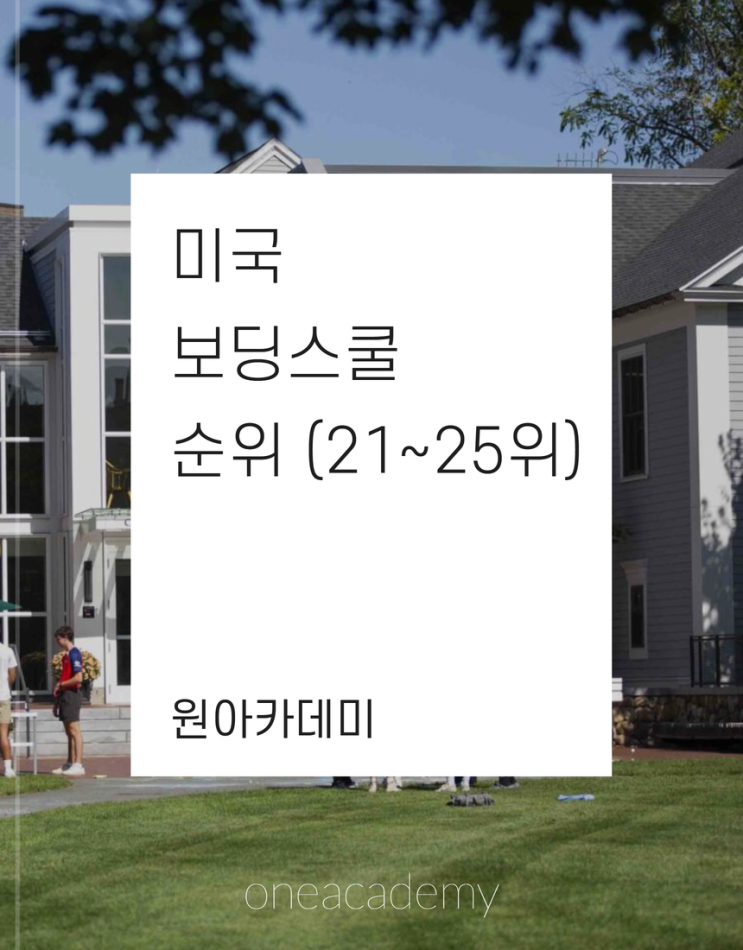 미국 보딩스쿨 순위 (21~25위) by. 압구정 원아카데미 (02-501-5590) 안녕하세요, 보딩스쿨 · 미국대학 전문 압구정 원아카데미 입니다. 오늘의 글에서는, 2026년 Niche 랭킹 기준 미국 보딩스쿨 종합 순위를 안내드리려고 합니다. 이번 글에서는 21~25위까지의 학교들을 먼저 소개하고, 다음 글에서는 26~30위의 학교들을 안내드릴 예정입니다. 보딩스쿨 랭킹은 평가 기관과 기준, 그리고 연도에 따라 비교적 유동적으로 변동되기 때문에, 순위 자체를 절대적인 기준으로 받아들이기보다는 각 학교가 지닌 교육 환경과 고유한 색깔을 이해하는 참고 자료로 활용하시는 것이 바람직합니다. 그럼 아래에서 학교별로 하나씩 살펴보겠습니다. 21위: ....... <img src="https://blogthumb.pstatic.net/MjAyNjAyMjVfNTMg/MDAxNzcxOTg0ODk5OTEx.xipy1Al0fwbLsy7C8S3rCBDdIPzT8kPZmt4KcbcWUMYg.QA092_GKcmGT1POP_-8Ka4WQfZ6r0RrZIyDzxmR3CeUg.PNG/%BA%F1%B1%B3%B0%FA_%C8%B0%B5%BF_%2812%29.png?type=s3" />