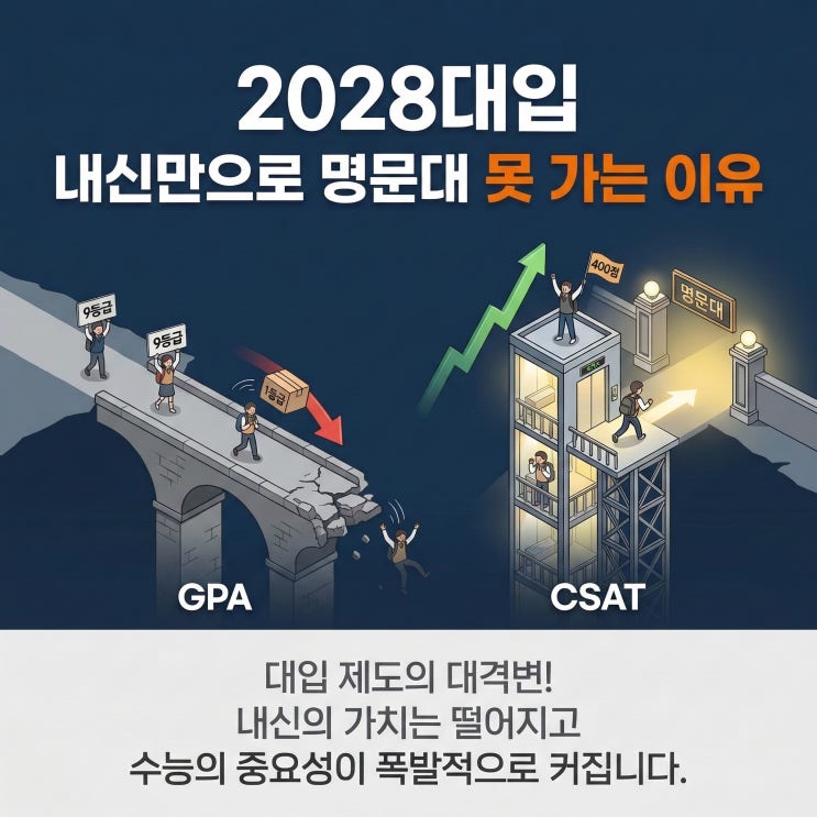 제목을 보고 들어온 학부모님! 잘 오셨습니다. 모두가 확실히 알아야할 2028년 대입부터 수능이 더 중요해지는 이유 (내신 5등급제 영향) 를 알기쉽고 명확하게 정리해드릴게요! 최근 교육 정책 변화 중에서 학부모와 학생들이 가장 많이 궁금해하는 것이 바로 2028학년도 대입부터 내신과 수능의 영향이 어떻게 달라지는지예요. (그러니까 2025년에 고등 1학년으로 입학한 학생들과 그 이후 학생들이 해당 대상이죠.) 결론부터 말하면 대학 입시 구조 자체가 크게 바뀌게 되었습니다. 다만 구조가 바뀐 것에 비해 내신과 수능의 중요성 자체가 바뀌었다고 할 수 는 없어요. 특히 상위권 대학을 목표로 하는 학생이라면 실제 체감에서는 수능의 중....... <img src="https://blogthumb.pstatic.net/MjAyNjAzMTBfMTMz/MDAxNzczMTM4MTM4NjU5.4dA2CNzOzisdUvqkFTdAuhruEi1isDFp4PJl3D8TvUsg.dg3VSZNbzjhWEzWoxf83G_bSmqgIY6sgl_X0rFrYUGIg.JPEG/Gemini_Generated_Image_axm13saxm13saxm1.jpg?type=s3" />