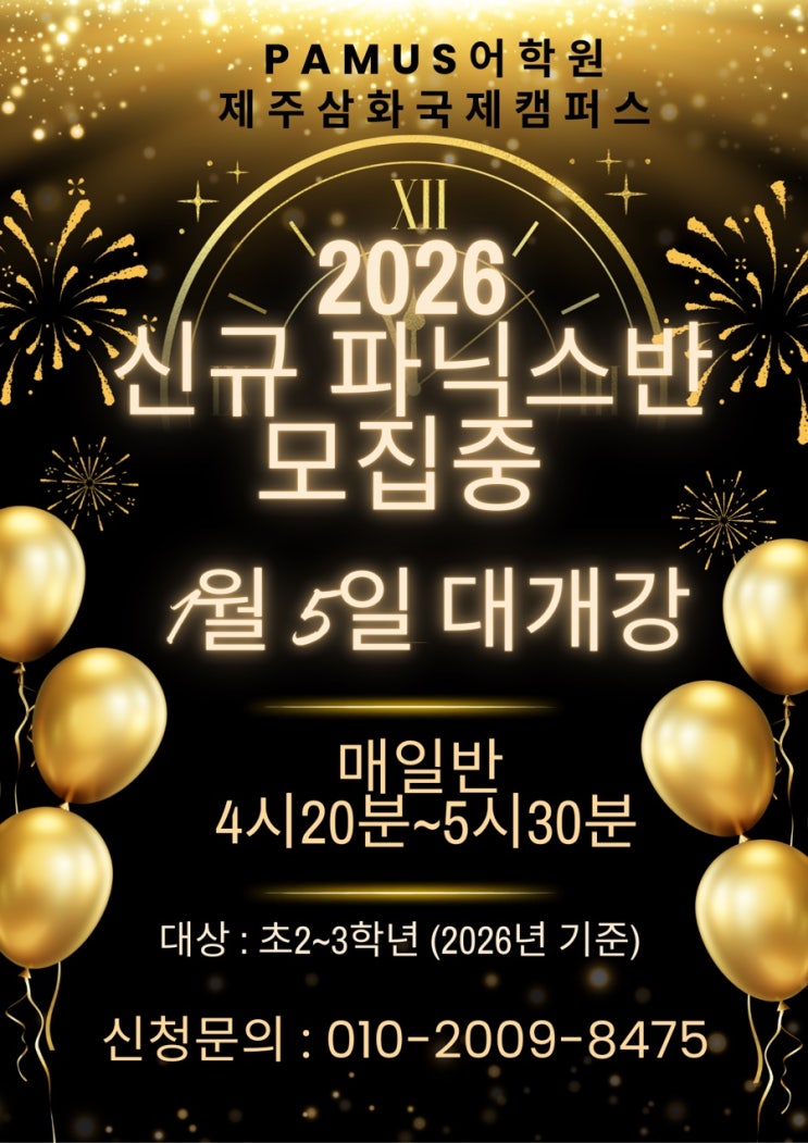 Hello, everyone! 우리 아이, 영어로 술술 말하고 쓰며 소통하는 영어, 매일매일 가고 싶은 스팟 파머스어학원제주삼화국제캠퍼스 Erica 원장입니다. 다가오는 2026년 1월5일 파닉스 신규반이 오픈 됩니다! 현재 남은 TO는 3명, 초등 2-3학년 모집중이며 매일반, 4시20분~5시30분 수업입니다. 단순 암기식 학습이 아닌, 내가 선생님이 되어 서로 즐겁게 소통하며 학습하고, 주입식 문장 학습 NO! 내가 하고 싶은 표현은 내가 직접 쓰고 말하는 말하고 쓰기 중심의 하이 퀄리티 파닉스 수업입니다. 고민은 기회만 놓칠뿐?( 늦출뿐 ) 문의 주세요 <img src="https://blogthumb.pstatic.net/MjAyNTEyMTZfOTcg/MDAxNzY1ODkxNDgyMjE3.jV5bU--kWyRcY3wMD1VJ2o-tlpieH6Qw3xYjxnjXid0g.ME2T8NeP-gASmlxtnxOJIetcdCulW9tm8JyngS72QKcg.JPEG/%C6%DB%C7%C3_%B9%CE%C6%AE_%C0%CF%B7%AF%BD%BA_%BF%B5%BE%EE_%C7%D0%BF%F8_%BB%F5%C7%D0%B1%E2_%BC%F6%B0%AD_%B8%F0%C1%FD_%C0%FC%B4%DC%C1%F6.jpg?type=s3" />