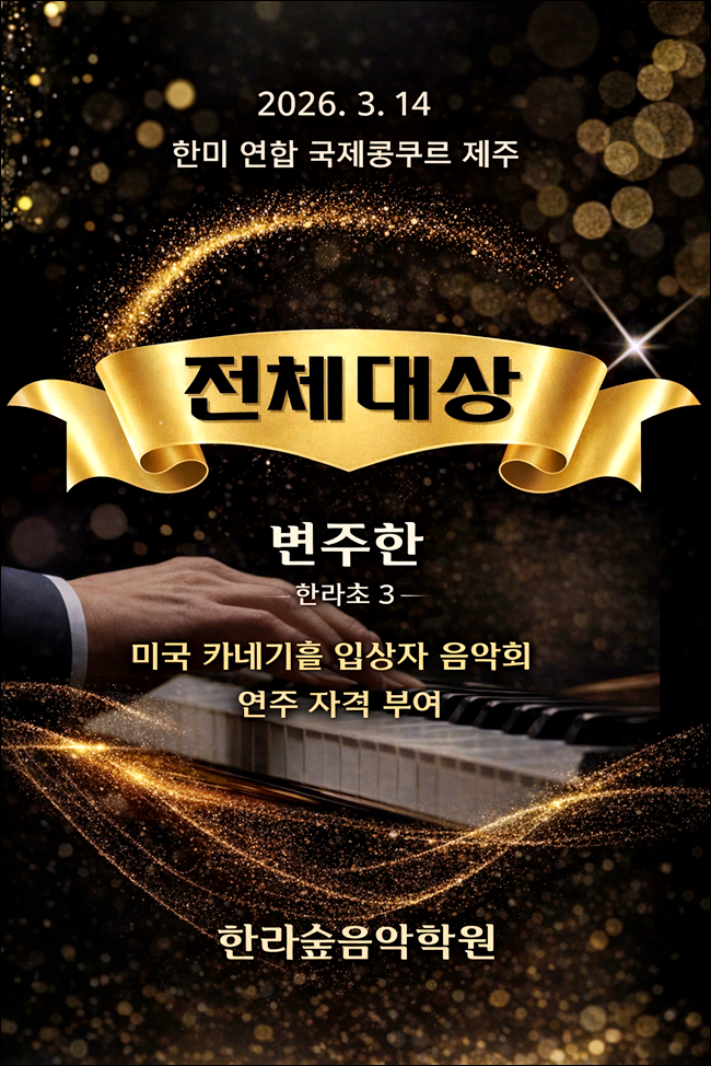 안녕하세요 한라숲음악학원입니다^^ 오늘은 학원에서 기쁜 소식을 전해드리려고 합니다. 꾸준히 연습을 이어오던 한 학생이 한미 연합 국제콩쿠르 피아노 부문에서 전체대상을 받는 값진 결과를 얻었습니다. 제주 연동 한라초 피아노학원에서 음악을 배우며 차근차근 실력을 쌓아온 과정이 있었기에 이번 결과는 학생에게도 학원에도 더욱 뜻깊은 순간이었습니다. 처음 피아노를 시작할 때부터 곡의 흐름을 이해하려는 태도와 꾸준한 연습 습관이 돋보이던 학생이었습니다. 대회를 준비하는 동안에는 곡의 표현과 분위기를 살리는 연주를 만들기 위해 많은 시간을 보냈습니다. 단순히 악보를 정확하게 연주하는 것에 머무르지 않고 음악의 흐름을....... <img src="https://blogthumb.pstatic.net/MjAyNjAzMTdfMjYz/MDAxNzczNzI2MzEyNzUx.Yo7lYgGAKtsiHoswWWzHEM132bm4lHd7prFA64QI8ccg.UwkEimyNCbuuI5opPZPKzatnH-uarHrbwT7PVCsvAFUg.PNG/KakaoTalk_20260316_081000430.png?type=s3" />