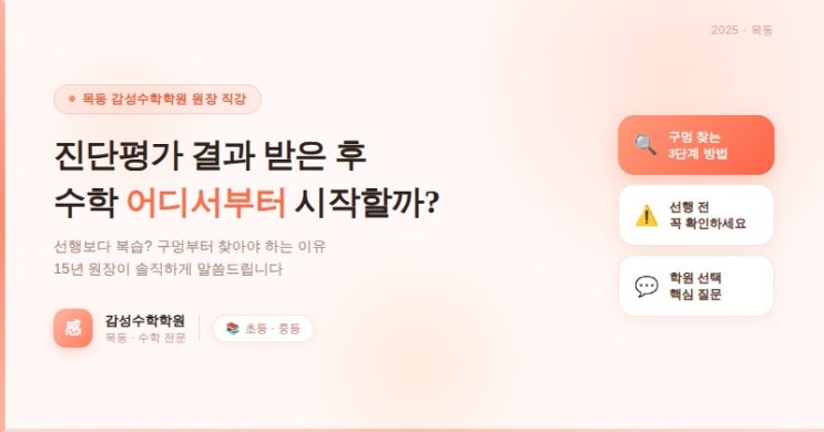 우리 아이가 수학이 부족하다고 느끼는 많은 부모님들이 이런 생각을 하십니다. “이제 어떻게 해야 하지?” “학원을 보내야 하나? 어떤 학원을 골라야 하나?” “선행을 시켜야 하나, 복습부터 해야 하나?” 오늘은 목동에서만 19년차 아이들에게 수학을 가르쳐온 목동 감성수학학원 원장으로서, 진단평가 결과 이후 부모님들이 가장 많이 하시는 질문에 솔직하게 답해드리겠습니다. 진단평가 결과는 크게 도달과 미달, 두 가지로 나뉩니다. 어떤 결과가 나왔든 지금 당장 필요한 건 같습니다. “어디서 구멍이 났는지 찾는 것” 도달했어도 방심은 금물입니다. 기초학력 진단평가는 말 그대로 최소한의 기준입니다. 도달했다는 건 바닥은 있다....... <img src="https://blogthumb.pstatic.net/MjAyNjAzMTFfNTIg/MDAxNzczMjA0ODI0Nzk3.g3LWuG1K2f4C_KXbWCfFOPpDVihjD0sMSax1hnaBPkcg.os_eGVUPPP0LrO6YOP931C6BCkMKN4TmUpqFGipOaWIg.JPEG/IMG%A3%DF1499.JPG?type=s3" />
