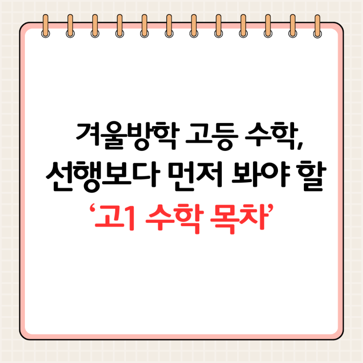 안녕하세요 예비 고1, 중3, 중2 자녀 두신 부모님들 요즘 이런 고민 한 번쯤 해보셨을 거예요. “겨울방학에 고등 수학 선행해야 하나요?” “주변에서는 다 수학(1)부터 하라는데… 이게 맞는 건가요?” 막상 시작하려고 보면 더 헷갈립니다. 누군가는 진도를 먼저 빼야 한다고 하고, 누군가는 기본부터 다시 해야 한다고 말하니까요. 문제는 대부분의 고민이 ‘무엇을 해야 하는지’보다 ‘무엇부터 봐야 하는지’가 정리되지 않은 상태에서 시작된다는 점이에요. 그래서 오늘은 어려운 설명은 잠시 내려두고, 2022 개정 교육과정이 반영된 고등 수학 공통수학 1, 2 전체 목차를 기준으로 겨울방학에 집중하면 좋은 단....... <img src="https://blogthumb.pstatic.net/MjAyNjAxMTNfMjky/MDAxNzY4MjY4Mjc0NTU5.sj5Y2lrZ5xp12KWy7JX05oTua_PjYrcGvKNUUIghmnIg.q2L_utPw73VH1EZSKEQ11jGM27MBpD-QVPy69hTtcdEg.PNG/1.png?type=s3" />