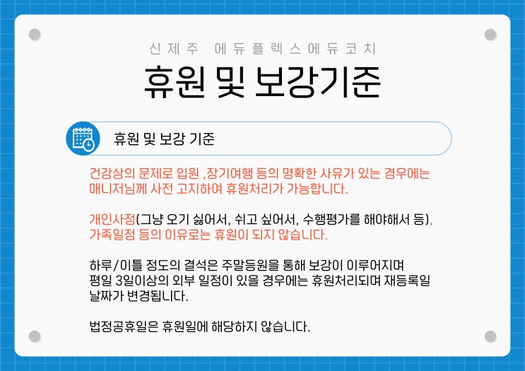 본 규정은 원활한 수업 운영과 학생 학습 보호를 위한 기준입니다. 1️⃣ 결석 규정 학생 개인 사정으로 결석하는 경우 수업 전 사전 연락을 원칙으로 합니다. 그냥 오기 싫어서, 쉬고 싶어서, 수행평가를 해야해서 등의 이유로는 휴원이 되지 않습니다. 입원, 장기 여행 등의 명확한 사유가 있을 시에만 매니저님에게 사전 고지한 상태에서 휴원처리 가능합니다. 사전 연락이 없는 결석은 보강하지 않습니다. 하루 / 이틀 정도의 결석은 월 20회 관리가 되지 않을시 주말등원을 통해 보강진행합니다. 평일 3일 이상의 외부일정(여행등)이 있을 때부터 휴원이 적용됩니다. 금토일 못나오는 경우는 휴원에 해당하지 않음. 나오지 못하는 날 중 평....... <img src="https://blogthumb.pstatic.net/MjAyNjAyMDlfNjQg/MDAxNzcwNjEyMzQxOTI5.MELDkiE2TuQ3vdmAg3uxj09OjlOG3robGkUEiTvKZLkg.X0xxpl5usZ-z6ap6TCQ3LfxCcdD-IA0khdeuE9R80iEg.JPEG/%C8%DE%BF%F8%B9%D7%BA%B8%B0%AD%B1%E2%C1%D8.jpg?type=s3" />