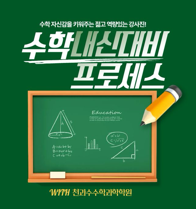 안녕하세요, 천과수 수학과학 학원입니다. 오늘은 저희 학원의 수학과목 내신 대비를 어떻게 하는지 알려드리려고 합니다~ 앞으로 예고된 입시개편안에서도 내신의 중요성은 점점 커지고 있어 내신 대비는 늘 학생분들과 학부모님들의 관심사인데요. 대치동이나 목동의 최상위권 수학 학원들도 대부분 수학은 더더욱 철저한 '수준별 수업'을 고집합니다. 수학은 학교이름이 아니라 '학생의 실력(Level)'에 맞춰야 성적이 오르는 과목이기 때문입니다! 오늘은 선생님들의 노하우와 열정, 그리고 천과수만의 꼼꼼한 관리 시스템이 담긴 <수학 내신 대비 프로세스>를 안내해드립니다 ^^ 철저하게 개개인 '실력(level....... <img src="https://blogthumb.pstatic.net/MjAyNjAyMDRfNDAg/MDAxNzcwMTk4ODg0MjUw.vhkxnHZdOpGCUdlFjeAlezILqQhHD1D2JHRb0kY1dVwg.eAqSQmIH_FCks_xWqxvoquMdaCX9YphiNIehNy1wWiMg.PNG/image.png?type=s3" />