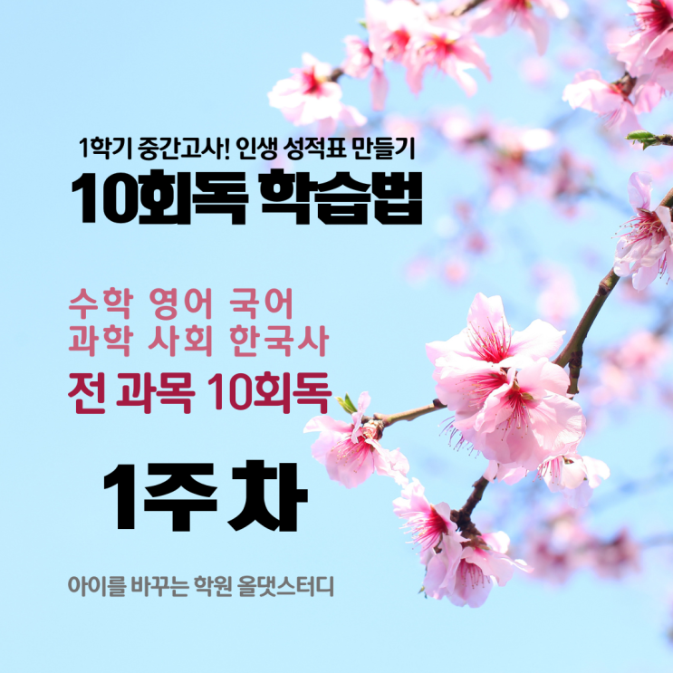 1학기 중간고사 필승 전략! 10회독 학습법 1주차 안녕하세요, 아이를 바꾸는 학원 올댓스터디입니다. 새 학기의 설렘이 가득한 3월, 우리 학생들은 벌써 1학기 중간고사를 향한 뜨거운 여정을 시작했습니다. 올댓스터디의 전매특허, ‘인생 성적표 만들기 - 10회독 학습법’ 1주 차 현장 소식을 전해드립니다! 3월, 꽃피는 공부 습관의 시작 3월 첫 주, 학교에서는 오리엔테이션이 한창이지만 올댓스터디의 시계는 이미 시험 대비 모드로 움직이고 있습니다. 이번 1주 차는 수학 과목을 중심으로 교과서 정복에 나섰습니다. 학습 목표: 전 과목 10회독을 위한 기초 체력 다지기 1주 차 집중 과목: 수학 (교과서 및 부교재 중심) 1주 차 진행 상황....... <img src="https://blogthumb.pstatic.net/MjAyNjAzMTJfMTc2/MDAxNzczMzA5MzkxNjUy.44UhobTEVQbIiUi5ziNpWe1XNuylYi_bq_8oKd9223wg.QUQeLv-x2DvGgb7dCe2KhOs3Qhqwyc4JahhyqqZzvugg.PNG/1.png?type=s3" />