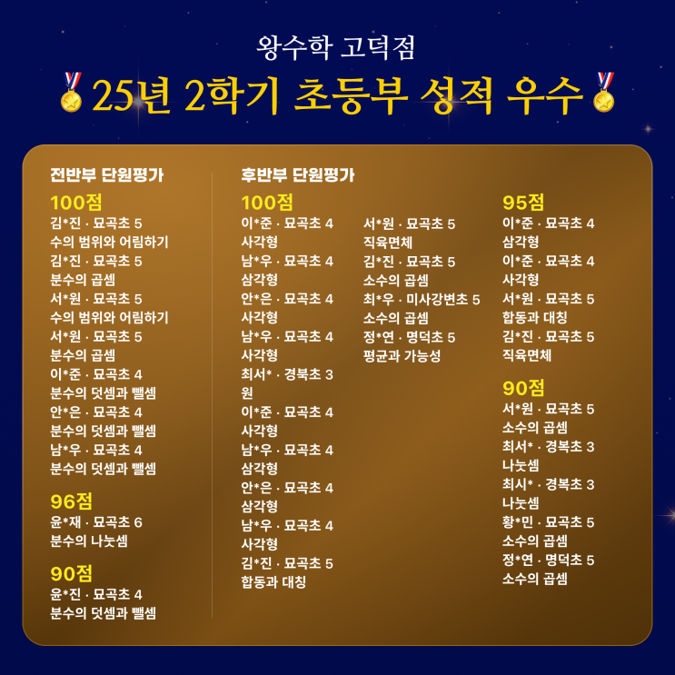 안녕하세요 학부모님들 :) 고덕동에서 소규모로 수학학원 운영중인 왕수학 고덕점입니다. 오늘은 2025년 2학기 성적 우수자 소식을 전해드리려고 합니다. 이번 학기에도 우리 학생들이 정말 열심히 해주었고, 그 결과가 점수로 확실히 증명된 한 학기였습니다. 우리 학생들 수준이 중위권 → 고득점으로 성장하는 흐름이 계속 이어지고 있다는 점에서 더 의미가 크고, 뿌듯함이 큰 한 해였습니다. 우리 초등부 학생들 전반부와 후반부 차이를 보시면 크게 체감되는게 상장수가 많아졌네요ㅎㅎ 우리 중등부 학생들 중등부는 시험 범위가 넓고 난이도가 올라가면서 개념 + 문제풀이 + 시간 전략까지 함께 만들어야 성적이 안정됩니다. 이번 2학기에....... <img src="https://blogthumb.pstatic.net/MjAyNjAxMjZfMTYw/MDAxNzY5MzU3MzMxMTYy.raIWI3bJPcNX0IdADhxqq379RfhROZV5CdTXlaW8wtog.pzaKxbjd1TtoxDPfeUSPpbgq7JMEuus5YHo4BImTEZwg.PNG/25%B3%E2_2%C7%D0%B1%E2_%C3%CA%B5%EE%BA%CE.png?type=s3" />