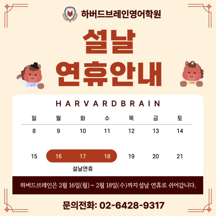 고덕동 영어학원, 하버드브레인 설 연휴 안내