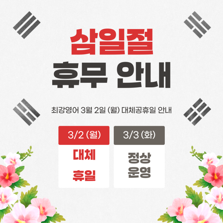 [최강영어] 3월2일 대체공휴일 휴강 안내 / 강동구영어학원 둔촌동영어학원 성내동영어학원 포레온영어학원