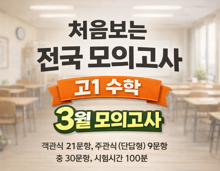 고등학교 1학년에 입학하고 처음 치루는 전국 모의고사가 다가옵니다. 2026년 3월 24일 시행으로 성적표는 2주정도 후에 받아보게 됩니다. 1학기 내신 대비가 아직 부족한 경우에는 모의고사 준비보다 내신준비에 몰두하는 것이 좋습니다. 대입에서 모의고사는 내신성적에 반영되지 않기때문입니다. 범위는 중등 전과정에서 출제가 되고, 보통 난이도 있는 문제들은 중3수학 내용이 주로 출제가 됩니다. 객관식 5지선다형 21문제와 단답형 주관식9문제로 구성되고 내신성적과 다르게 5등급제가 아닌 9등급제로 성적을 등급별로 구분합니다. 1등급은 상위0~4%, 2등급은 4~11%, 3등급은 11~23%정도로 평균과 표준편차에 따라 조금 변동이 있습니다....... <img src="https://blogthumb.pstatic.net/MjAyNjAyMjZfMTcz/MDAxNzcyMTE0MjE3ODg2.b8x9hlen6dFcXZzy4Ykg3MUKbJcTdfTCMn7oxW-WyYsg.ZSNeW-oNKsnNML6rwBKWOHDB_IiW9umtvSsUwf7hrIEg.PNG/3%BF%F9_%B0%ED1_%BC%F6%C7%D0_%B8%F0%C0%C7%B0%ED%BB%E7.png?type=s3" />