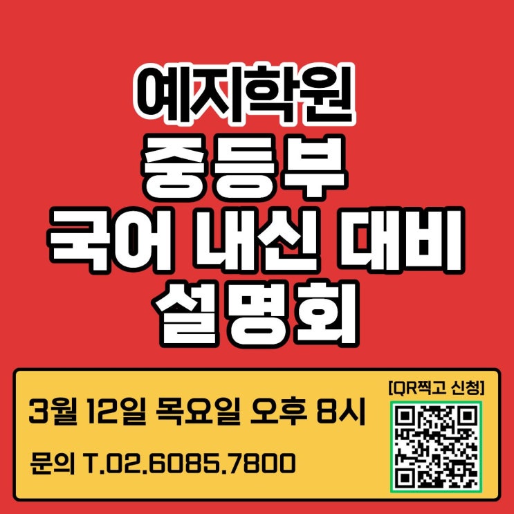 안녕하세요 고덕역 학원가에 위치한 국어전문 예지학원입니다. 예지학원에서 중등부 국어내신 대비 설명회를 진행합니다. 학교별 내신을 분석하고 내신 대비의 방향을 구체적으로 안내드립니다. ------------------- 1. 일시 : 3월 12일 목요일, 오후 8시 2. 신청방법 : 하단의 URL 또는 QR찍고 신청 https://forms.gle/k5FnZhxCf819jtsZ7 예지학원은 항상 최선을 다 하겠습니다. 문의전화 : 02-6085-7800 <img src="https://blogthumb.pstatic.net/MjAyNjAyMjdfMTAy/MDAxNzcyMTc3NzYzMTMw.7T2tJHyBOTW0rfkp0UolfpEJ_v0LaaEf0sRFyTnscSUg.7O8DvmQZkdB6Ljf5QJk0z6uArC-h7aTJY9diQdcthH4g.JPEG/%C1%DF%B5%EE%B1%B9%BE%EE%BC%B3%B8%ED%C8%B8.jpg?type=s3" />