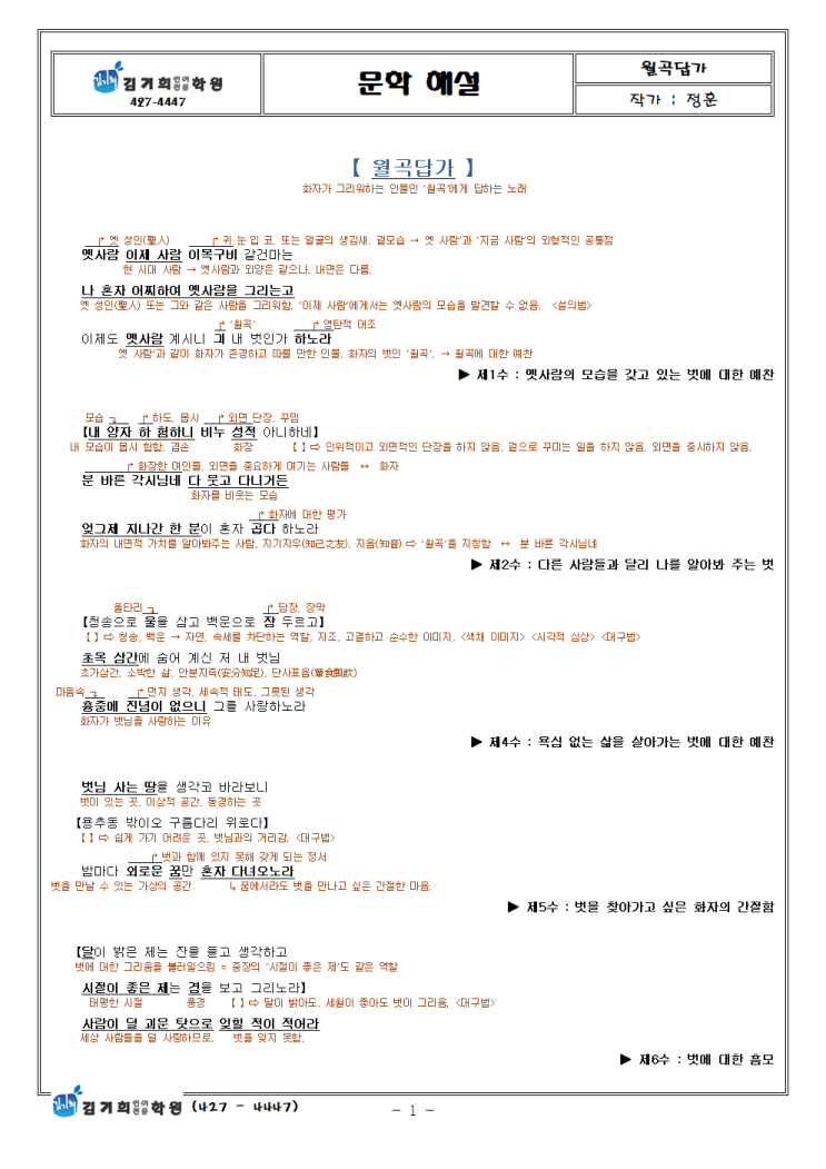 [ EBS 수능특강 문학 해설 ] 【 월곡답가 】 - 정훈 ❚ 개관(槪觀) ❚ 옛 성현 같은 벗 월곡 외면만 중시하는 이제 사람 내면을 중시하는 나를 곱다하는 벗 월곡 속세를 멀리 하고 신선처럼 사는 벗 월곡 그가 사는 곳 용추동 밖 구름다리 위 뫼는 첩첩 구름 잦아 보이지조차 않네 연, 그리, 안타, 월곡, 속세, 자연, 신선, 10, 찬, 판, 친화, 탄, 교, 각, 그리, 모, 대비, 비판, 찬, 고사, 탄, 계 <img src="https://blogthumb.pstatic.net/MjAyNjAyMjhfMTA1/MDAxNzcyMjg5ODE0ODc1.8ACmx00MbamdpjxNZvdlEOjSievZ3nOgGjPFsuJ9EQ0g.VR70HWpSG8o5UugQqQb92K4OddbzyE83J67y0lQc0_0g.PNG/%BF%F9%B0%EE%B4%E4%B0%A1_%28%C1%A4%C8%C6%29_%C7%D8%BC%B3001.png?type=s3" />