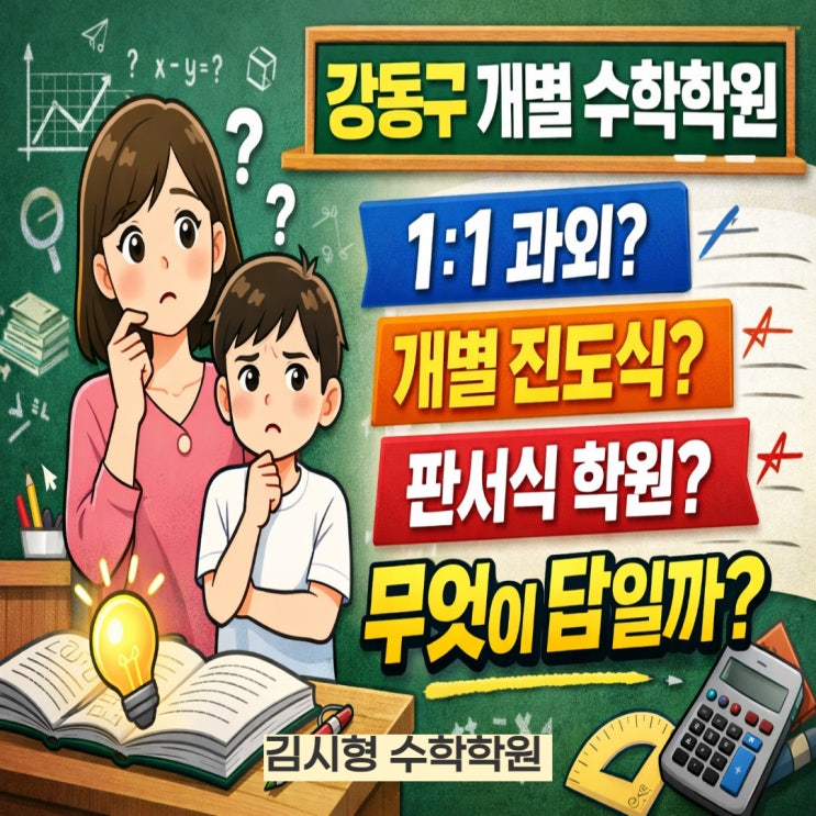 안녕하세요? 강동구 개별 맞춤형 수학학원 김시형 수학입니다. 부모님들 공통 질문이 하나 있습니다. “소수정예 수업이 좋을까요?” “개별 진도식 학원이 좋을까요?” “아니면 대형 학원이 맞을까요?” 수학은 한번 방향을 잘못 잡으면 6개월, 1년이 그냥 흘러가 버립니다. 그리고 그 시간은 다시 되돌리기 어렵습니다. 개별 맞춤형 수업 전문 김시형 수학 1. 개별 수업의 장점 1) 장점 - 학생 맞춤 수업 가능 - 진도와 교재 선택 상당부분 자유로움 - 모르는 부분 즉시 질문 가능 특히 수학이 너무 약하거나 반대로 매우 상위권 학생이라 더 빠른 진도가 필요한 경우에는 개별 맞춤형 수업이 효과적입니다. 2) 단점을 보완하는 김시형 수학 시....... <img src="https://blogthumb.pstatic.net/MjAyNjAyMjhfMjcw/MDAxNzcyMjU1Njc5MzQ2.yUOJ7DeRmLTy5PMnozx1kIAsCTJ9Jsi3eHjXrX5PQVgg.oP0HE3o2PVxprzSpl8Aq20ZBp9AWbJuEya5F7QOIKl8g.JPEG/%C1%A6%B8%F1%C0%BB_%C0%D4%B7%C2%C7%CF%BC%BC%BF%E4_%2827%29.jpg?type=s3" />