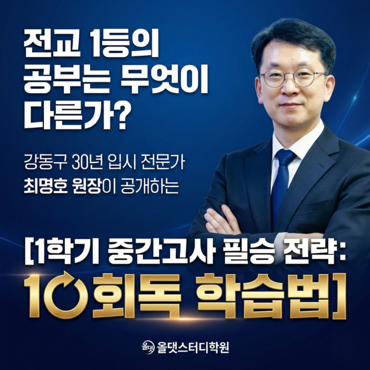 전 과목 10회독 학습법 반갑습니다. 강동구에서 30년간 수많은 학생의 변화를 지켜보며 입시 현장을 지켜온 올댓스터디학원 원장 최명호입니다. 성적이 정체되어 있거나 공부에 흥미를 느끼지 못하는 학생들의 공통점은 '반복'의 힘을 믿지 못한다는 것입니다. 대다수 학생이 시험 범위를 한 번 훑어보는 것조차 버거워하지만, 역설적으로 '성적 향상의 기적'은 모두가 기피하는 그 반복 속에 숨어 있습니다. 올해 1학기 중간고사를 대비해 우리 올댓스터디 원생들에게 적용할 '전 과목 10회독 학습법'의 핵심과 단계별 전략을 정리해 드립니다. 1. 왜 하필 '10회독'인가? (반복이 두려운 아이들에게 전....... <img src="https://blogthumb.pstatic.net/MjAyNjAyMjdfOTYg/MDAxNzcyMTU1NjkwODE0.oyMmJXnSnwRCQP2xgcvkbJluD1LNLOERHDOWybk3t-kg.AzrLdzKVeKL0mUHwMvlyqzjYUf4v0wAhf8qihvhpbI4g.PNG/1.png?type=s3" />