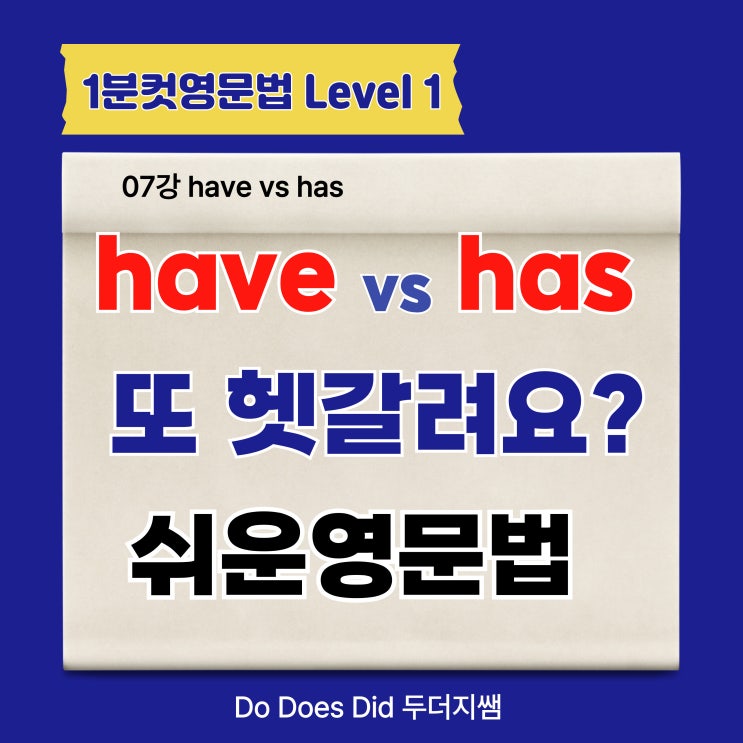 안녕하세요. 초등학생, 중학생 직접 가르치는 현직 학원선생님 1분컷영문법 저자 두더지 에이미쌤이에요. 수업하다 보면 꼭 나오는 질문이 있어요. “쌤… have예요? has예요? 이거 은근히 맨날 헷갈려요…” 맞아요. 기초영문법 have, has 차이 헷갈려해요. 근데 사실은요, 뜻은 동일하게 '가지고 있다' 라 쉬운데 문제는 단 하나예요! 영어문법 문제를 풀 때 동사가 아니라, 주어를 안 보고 풀어서 그래요. 제가 아이들한테 항상 먼저 시키는 게 있어요. 문제 막 풀지 말고 세모눈으로 째려보고 동그라미 치고 시작하기! 어디? 주어예요! 그럼 우리 초등 중등 제자들 가끔 "쌤.. 근데 주어가 어디 있어요?"바로 문장 맨 앞....... <img src="https://blogthumb.pstatic.net/MjAyNjAzMDFfMjMy/MDAxNzcyMzQ0MDQ1MzQ2.Ru69w6CtXBmSNgkI7wn4fWiQcJQTBKQ7w1Wbqyoirogg.vXDWNotior_Zp3CJfCReWth1M1Q9pHrZBCyeHAe-jIog.JPEG/have-has-%C2%F7%C0%CC%C1%A1-%B1%B8%BA%B0%C7%CF%B1%E2-009.jpg?type=s3" />