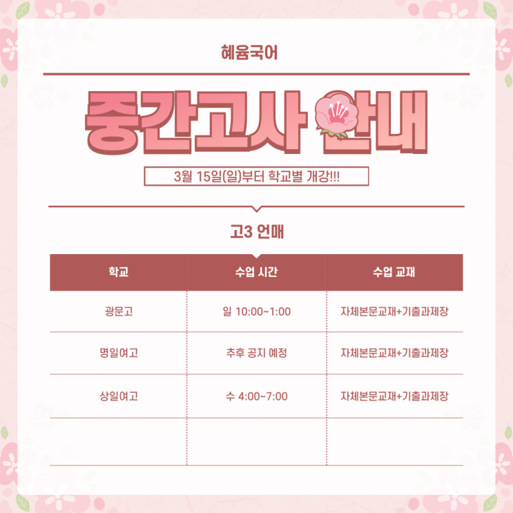 고3 중간(1학기) 언매 내신대비반 개강 안내