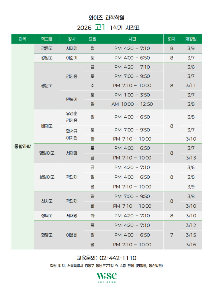 와이즈과학학원 2026 통합과학 1학기 시간표 We, wise. 어차피 강동구 과학탐구는 와이즈입니다.) ☎ 교육문의 : 02) 442-1110/ 010-5959-1191(문자전용) 위치 : 서울특별시 강동구 동남로 73길 9(동신 빌딩) 4층 와이즈 과학학원 #와이즈과학학원 #강동구 고등과학학원 #강동구 통합과학내신 #배재고통합과학 #광문고통합과학 #한영고통합과학 #강일고통합과학 #상일여고통합과학 #명일여고통합과학 #강동고통합과학 #선사고통합과학 #성덕고통합과학 #통합과학내신대비 <img src="https://blogthumb.pstatic.net/MjAyNjAyMDNfMTUg/MDAxNzcwMTAyMDQ3Nzk0.MlXk81UMK201vbVddUMRJPjTnySIwUge5Gc6_78QH2sg.V4hjxlK5F2zvZTDk05FIFr8x8aaSLG7qQjkGg3IXE7Ag.PNG/26_1%C7%D0%B1%E2_%BD%C3%B0%A3%C7%A5002.png?type=s3" />