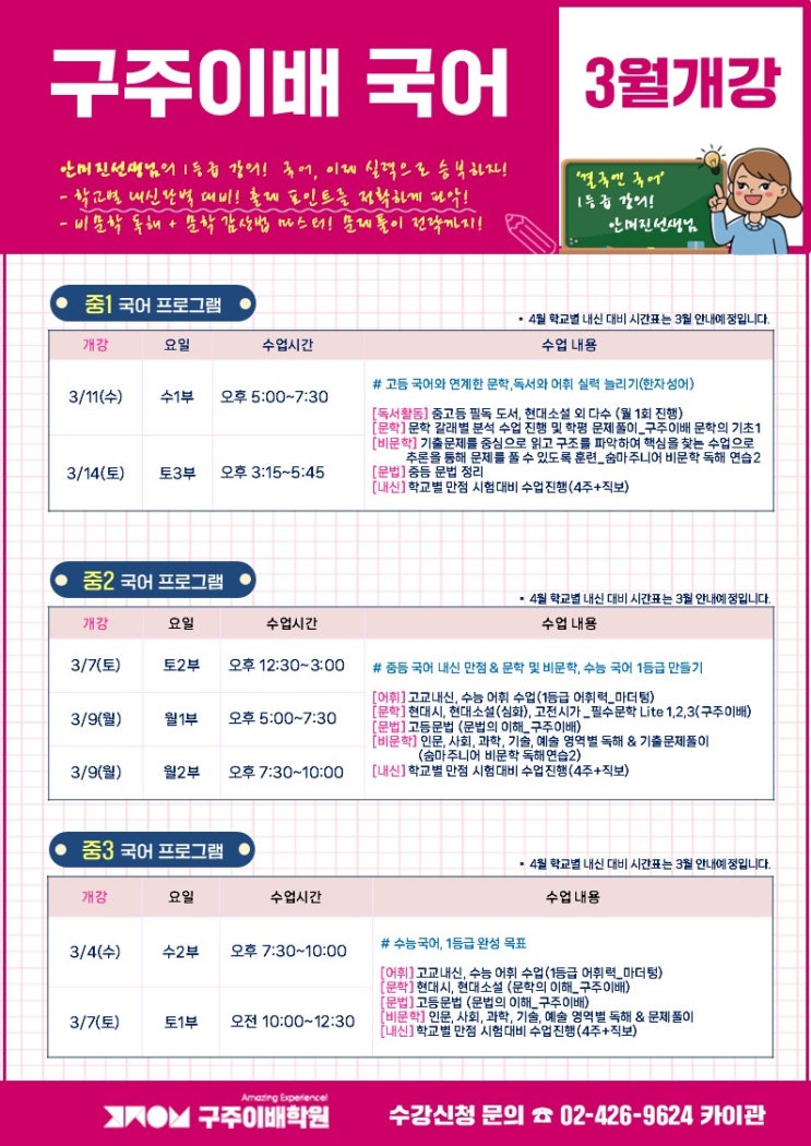 안녕하세요 구주이배 학원입니다. 2026학년도 3월 신학기 구주이배 국어 수업 개강 안내 드립니다! 2026학년도 3월, 국어가 달라지면 결과가 달라집니다!! 새 학년이 시작되는 3월, 국어를 어떻게 시작하느냐에 따라 1년의 흐름이 달라지는데요. ✔ 독해가 흔들리면 전 과목이 흔들립니다. ✔ 국어가 잡히면 내신도, 모의고사도, 수능도 안정됩니다. 국어 성적이 오르면 전체 성적이 오른다! 이 말, 이제 결과로 보여드리겠습니다. 왜 지금, 국어를 시작해야 할까요? 최근 수능과 내신은 단순 암기가 아닌 문해력(독해력)과 사고력 중심 평가로 완전히 바뀌었습니다. 지문은 길어지고 선택지는 더 정교해지고 서술형·논술형 비중은 확대되고....... <img src="https://blogthumb.pstatic.net/MjAyNjAyMjhfMTAg/MDAxNzcyMjczODg3Nzk4.RarlSIR36CiJ3QpCjYVgxx-rlfuUIXKJ5wd1uC-OKj8g.Q6zonuRKIsUJx-WQOEv8rBKa5LrUgD9eMiMpzQZOnsUg.JPEG/2602_%B1%B9%BE%EE_3%BF%F9%B0%B3%B0%AD_%BE%C8%B3%BB%B9%AE.jpg?type=s3" />