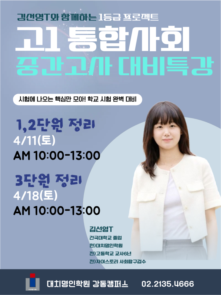 김선영T와 함께하는 고1 통합사회 중간고사 대비 특강 시험에 나오는 핵심만 압축 정리 학교 시험 대비 완벽 마무리 특강입니다. ✔ 학교 시험 핵심 개념 정리 ✔ 출제 포인트 집중 정리 ✔ 시험 직전 점수 올리는 마무리 강의 1·2단원 정리 4/11(토) AM 10:00 - 13:00 3단원 정리 4/18(토) AM 10:00 - 13:00 김선영T 건국대학교 졸업 전 고등학교 교사 자이스토리 사회탐구 검수 #강동구사탐학원 #고덕동사탐학원 #강동구고등학원 #통합사회 #고1통합사회 #통합사회내신 #중간고사대비 #내신대비 #시험대비특강 #강동고등학원 #고1내신 #내신관리 #강동명인학원 #대치명인학원강동캠퍼스 #통합사회 #고1중간고사 #....... <img src="https://blogthumb.pstatic.net/MjAyNjAzMjZfNzUg/MDAxNzc0NTE1Nzg0ODI5.OGlCr9xvrkkvfA2H37PiincAmJr0KiR8SAK54EuLcWYg.RoxygRMR8VBLeOXQhH68KG89F2nSmqclIGoOMKmwAJMg.PNG/%B1%E8%BC%B1%BF%B5T-%C1%F7%BA%B8.png?type=s3" />