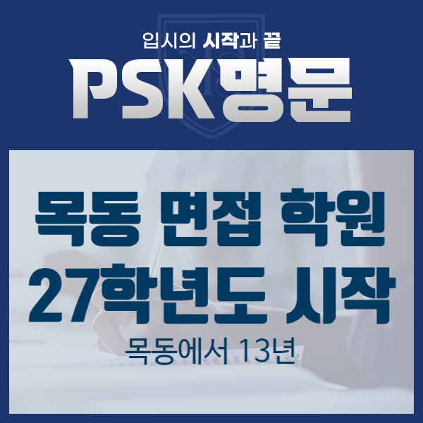 안녕하세요 PSK명문입니다. 27학년도 대비 입시가 이제 시작됩니다. 3월이 되면 새학기가 시작되고 고교학점제 전 마지막 세대의 입시의 시작입니다. 고교학점제가 시행되면 대학별로 좋은 인재를 선발하기 위해 면접을 강화할 것으로 예상되며, 27학년도에서는 이를 확인하기 위해 면접을 강화할 준비를 할 것입니다. 입시가 변해도 변하지 않는 본질을 찾아 학습해야 학생들의 불안을 잠재우고 지금 현재에 집중할 수 있습니다. 목동에서 13년간 대입 수시 컨설팅 및 면접을 진행하며, 26학년도 대입 수시 면접 수업을 마무리하며 느낀 점은 하나입니다. 면접은 운이 아니라, 준비의 질이다. 목동에서 13년, 데이터로 증명하는 목동 PSK명문 면....... <img src="https://blogthumb.pstatic.net/MjAyNjAyMjFfOTcg/MDAxNzcxNjQyNDAzMDc0.3wbNpZ5Rp5DC9GHCIo7RLE7NNcRpVRNt1j9VRxwY9twg.NREJVnwrKlKDzR8GMSjn2mqoCCO6MW7-hWTyqRYlefsg.PNG/PSK%B8%ED%B9%AE_%BD%E6%B3%D7%C0%CF.png?type=s3" />