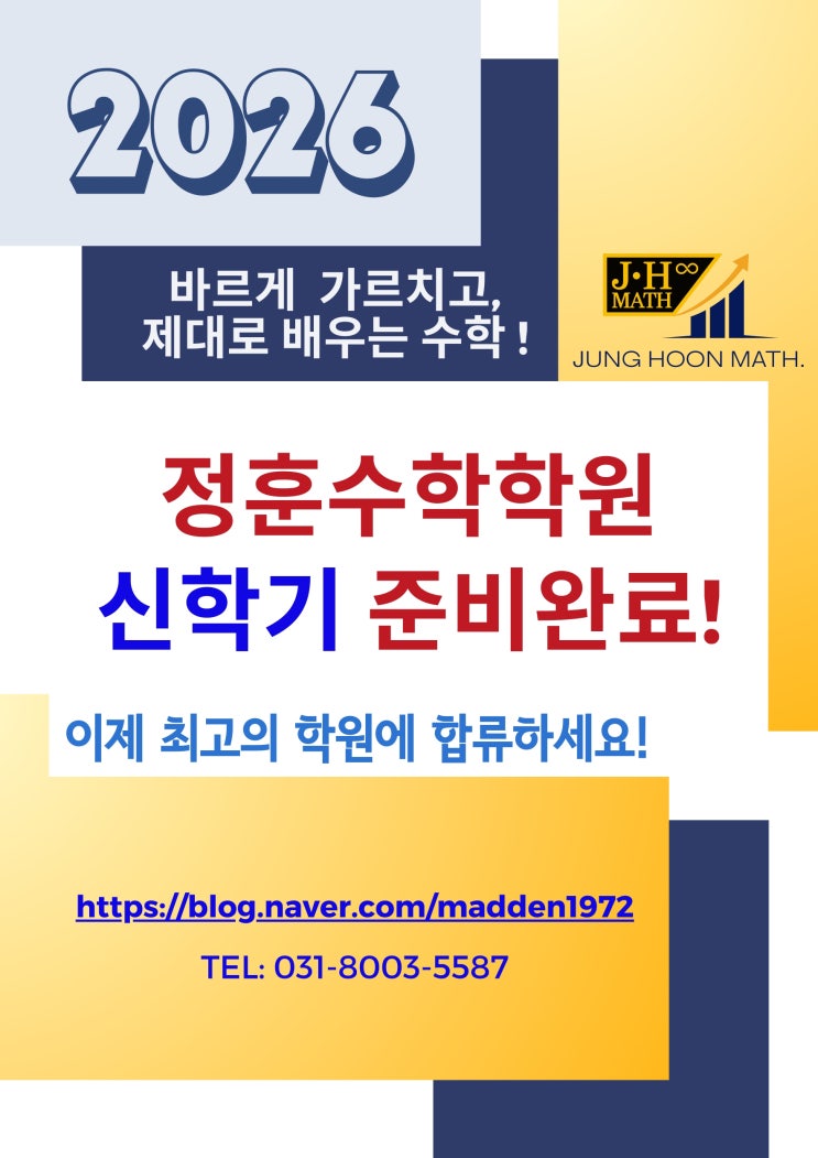 새로운 2026년 신학기가 시작됩니다. 방학동안의 치열했던 준비와 방심하기 쉬운 2월을 조심스레 지나, 드디어 새로운 시작입니다. 준비는 철저했고, 마음가짐 또한 단단합니다. 이제 제대로 붙어보고 이길 일만 남았습니다. 우리 정훈수학학원은 모든 학생들의 새로운 시작을 응원합니다. 여러분들도 최고의 학원에 합류하세요. 그리고 더욱더 단단해지길 바랍니다. <img src="https://blogthumb.pstatic.net/MjAyNjAyMjRfMTc3/MDAxNzcxOTE5NzYwMDMz.y0nXSD8tf8YrSsoQc5otI6ckcmj33P_MmG9ku1a6l-sg.IsRDpi5zaEZxWBf1Zwfw_-3vaQ7t1co3qNX7qUYXAjMg.JPEG/%C0%FC%B4%DC%C1%F6_%289%29.jpg?type=s3" />
