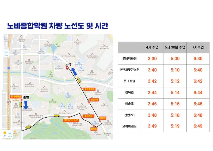 안녕하세요, 노바종합학원입니다! 우리 아이들의 안전하고 편리한 등원을 위해 운영 중인 셔틀버스 노선도와 시간표를 안내해 드립니다. 학부모님들께서는 아래 내용을 확인하시어 아이들의 수업 시간에 맞춰 차량 이용에 참고 부탁드립니다. 노바종합학원 차량 운행 안내 노바종합학원은 롯데백화점에서 출발하여 청목초, 신안2차, 모아미래도를 거쳐 학원까지 안전하게 운행합니다. ※ 유의사항 도로 교통 상황에 따라 2~3분 정도 차이가 발생할 수 있습니다. 아이들의 안전을 위해 정해진 시간보다 1~2분 먼저 정류장에 나와 기다려 주시길 권장합니다. 차량 이용 관련 문의사항은 학원으로 연락 주시면 친절히 안내해 드리겠습니다. 우....... <img src="https://blogthumb.pstatic.net/MjAyNjAyMjhfMTQ3/MDAxNzcyMjYyMzExMjc1.x00UguQmNS1o5Op677_tkJCaYjSUfqQh6Hr90RyV8HEg.AsjNXBJgDpptlrqwDlVQNcXrgRzFyDCMlcXxOSBuJhgg.JPEG/%C1%A6%B8%F1%C0%BB_%C0%D4%B7%C2%C7%D8%C1%D6%BC%BC%BF%E4._-_2026-02-28T154019.371.jpg?type=s3" />