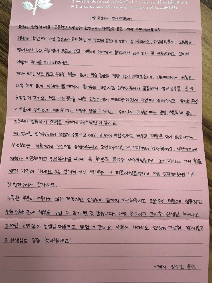 저희 학원에서 수의예과에 최종 합격한 학생이 등장했습니다!! O빈아 너를 처음 봤을 때가 기억난다. 너의 첫인상은 너무 이성적이었지. 차갑고 냉정한 거 같았어. 마스크를 끼고 있어서 웃는 건지 우는 건지 분간을 못하겠더구나. 시간이 흐를수록 웃음도 많아지고 질문도 많아지더구나. 나의 아재 개 그는 집에 가서 웃긴 법이지. 인정한다. 너의 질문은 정말 날카로웠어. 잊지 못한다. 오늘은 어떤 질문을 할지 수업 전에 설레어 본 적도 있다. 넌 부족한 게 없었다. 오히려 네가 나의 부족함을 채워줬다. 나를 깨워준 건 너였다. 가장 존경하는 사람이 누구냐고 물었을 때 고민 없이 나라고 한 마지막 문구를 보고 눈물이 살짝 흐를 뻔했다는....... <img src="https://blogthumb.pstatic.net/MjAyNjAyMTlfMTkz/MDAxNzcxNDgwNDQxNzgy.Fo-77XG4MS805HdIWQ5XmbUVae1sHc00yKOoHgJVIEYg.p3rUW51iLI-yL_mvSIK9Awt-mbnjv6VPlKzYDLNXJwQg.JPEG/IMG_1880.jpg?type=s3" />